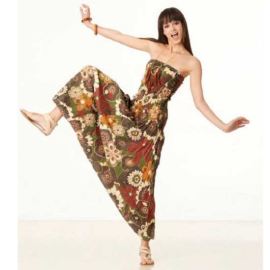 Shown here is a strapless dress featuring a fitted bodice and a ankle-length skirt. The allover floral patterns offer this dress an idyllic style. This cotton dress makes an ideal companion for the summer.