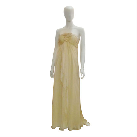 With delicate ruched details, fabric floral adornment and a flowing ruffle at the bust, the strapless dress wraps any lady in celestial beauty. The flattering empire waistline sets off a slender figure, whereas layers of sheer fabric convey an ethereal ambiance, bringing airy lightness to any move.