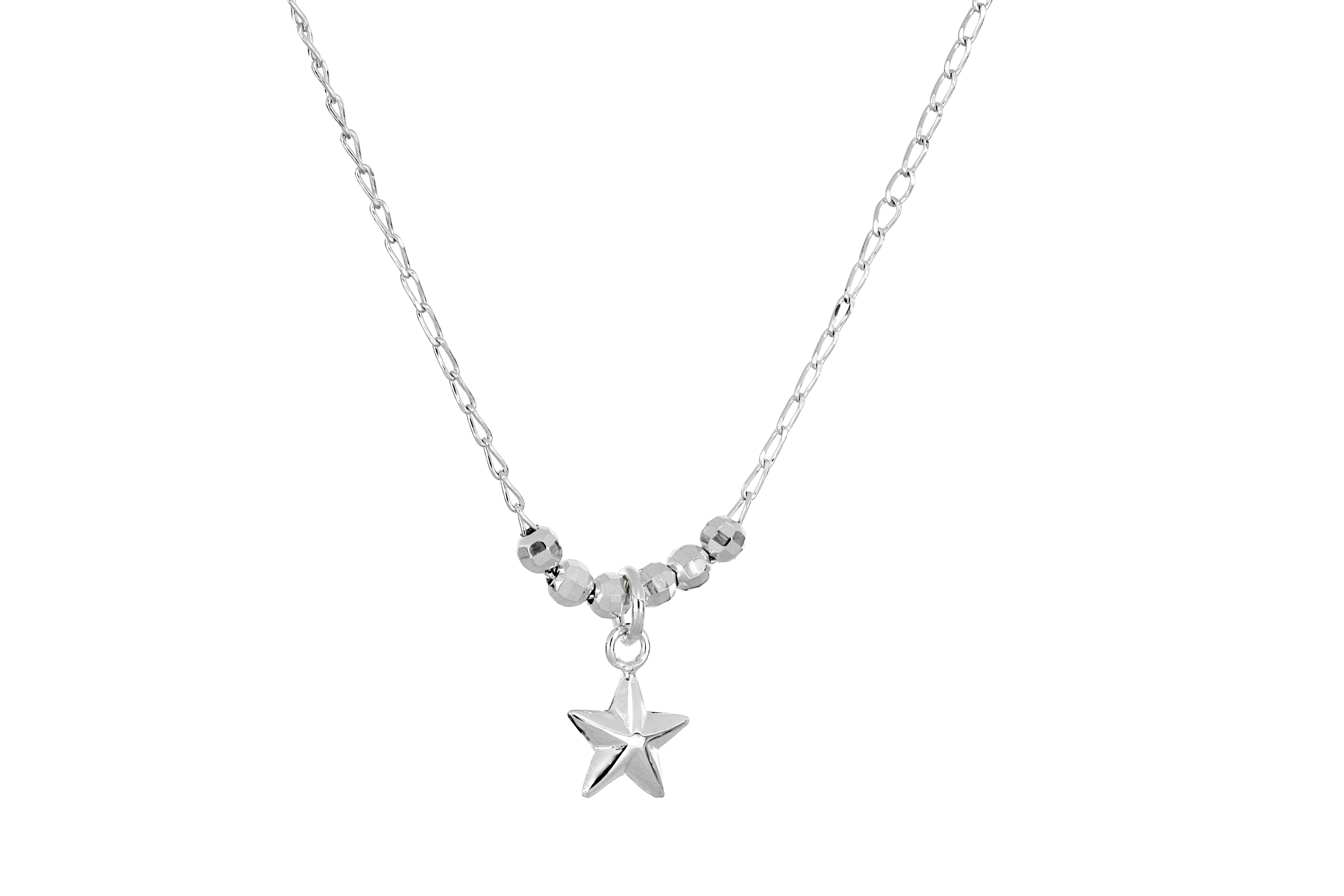 A stunning 925 sterling silver necklace featuring a delicately crafted star pendant, adorned with shimmering diamond-cut beads for a touch of elegance and charm. Available in adjustable chain lengths of 45, 50, and 55 cm to suit your style. Expertly handcrafted in Mexico, this necklace adds a unique, meaningful accent to any outfit
