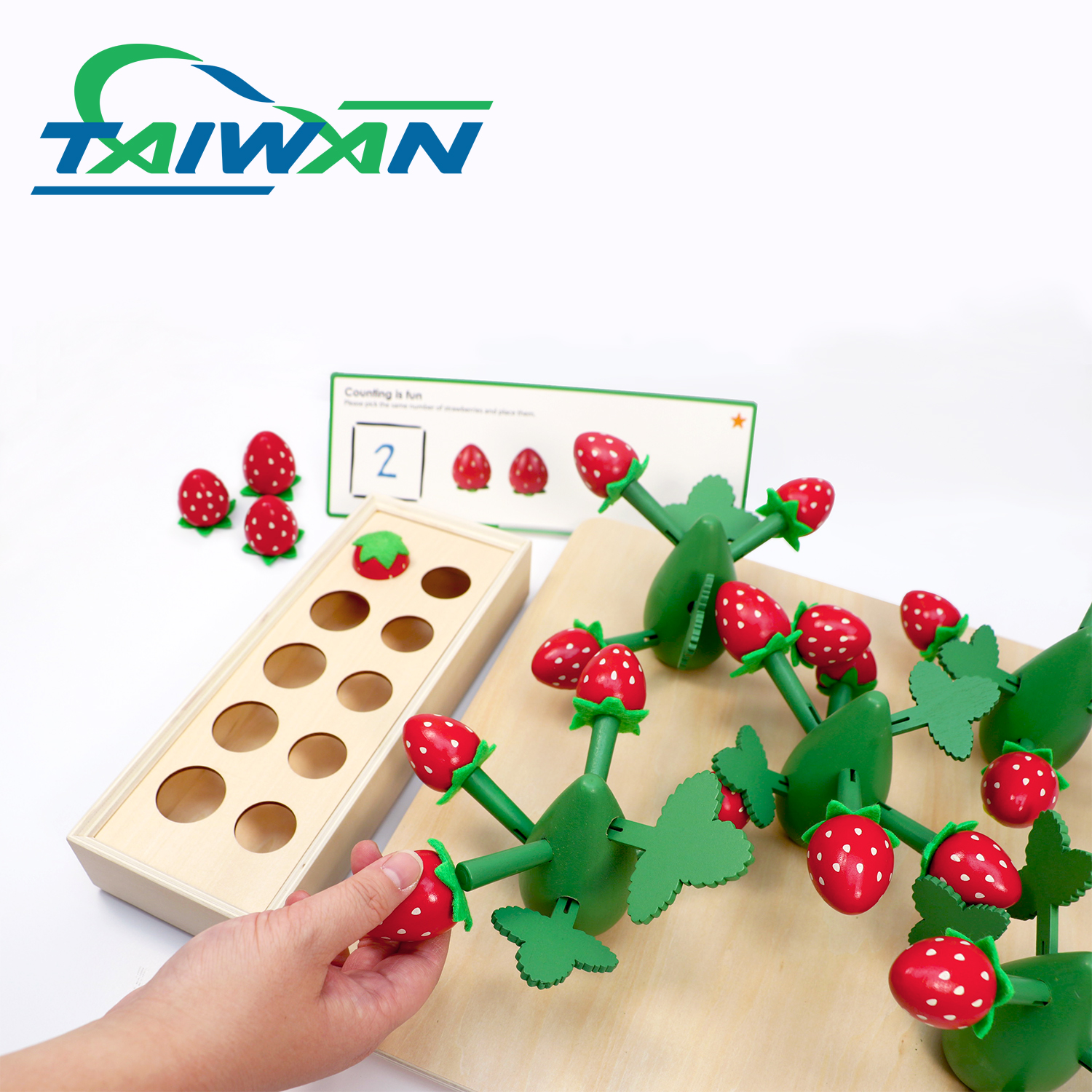 Can be played by multiple players or individually. Design two sizes of wooden strawberries and use magnets to connect the strawberries to their stems. Children can use the topic cards to imitate the growth and picking of strawberries. In the process of role-playing, they can learn basic mathematical concepts such as spatial orientation (up, down, left, right), counting and calculation, comparison、classification、 arrangement.