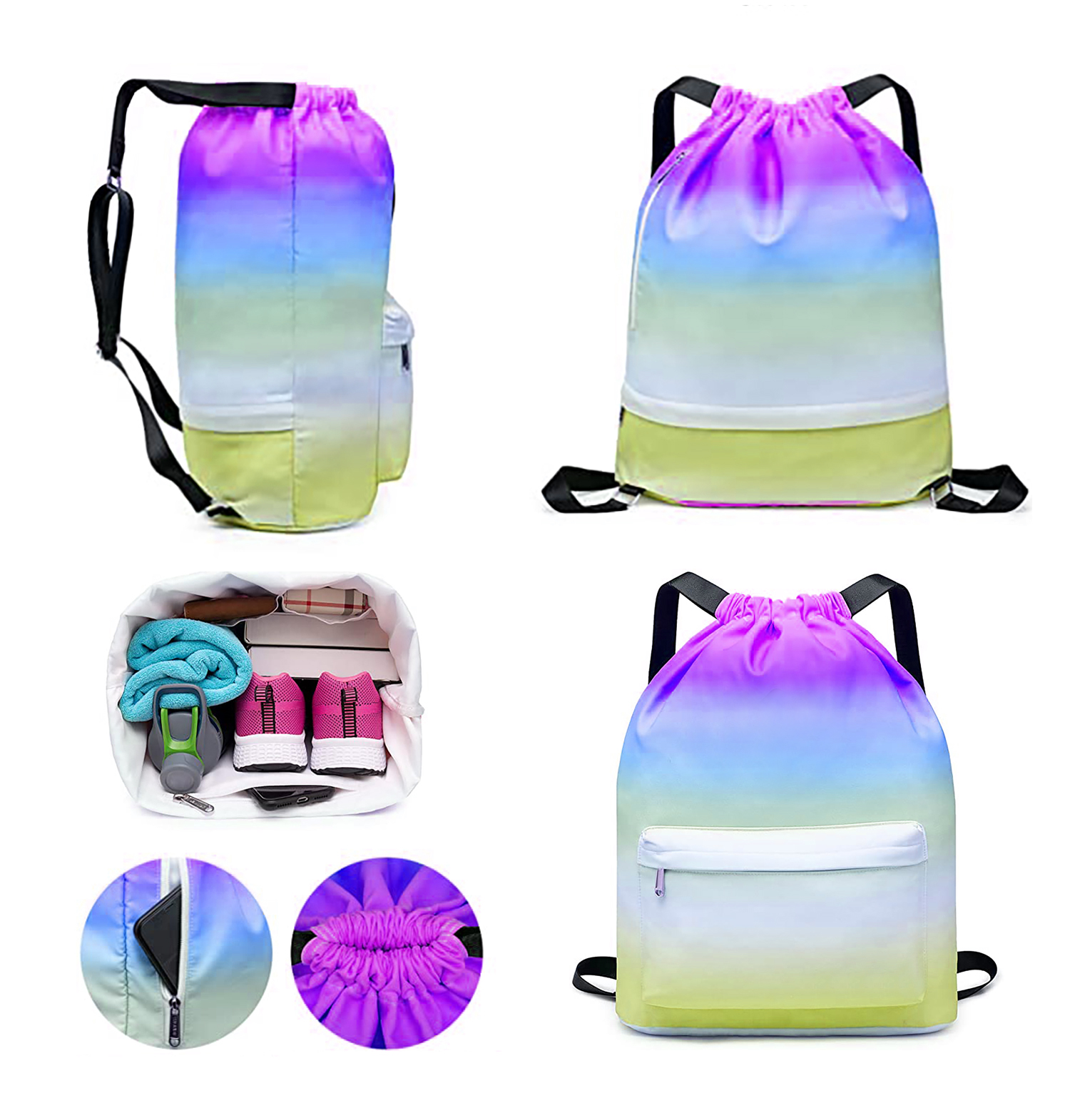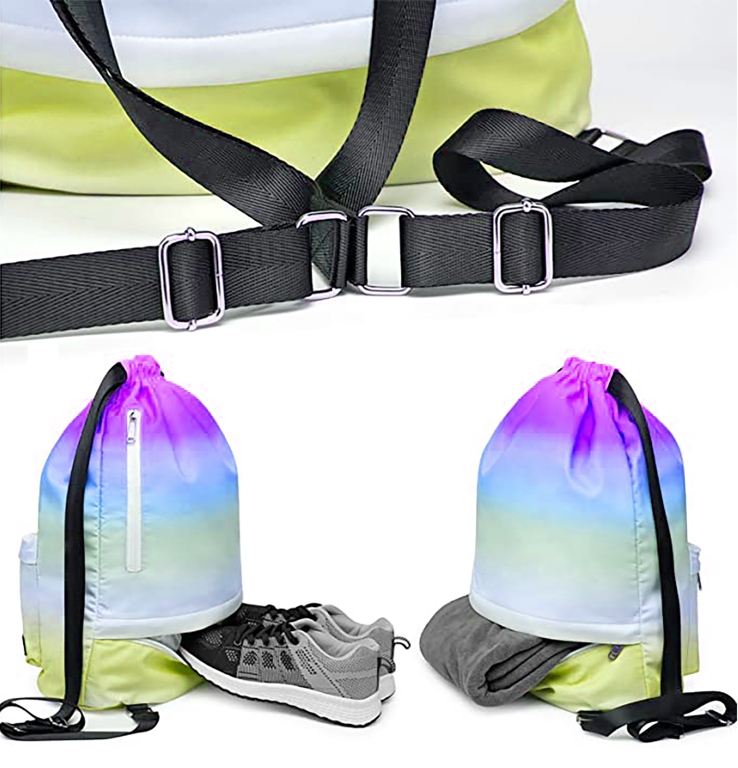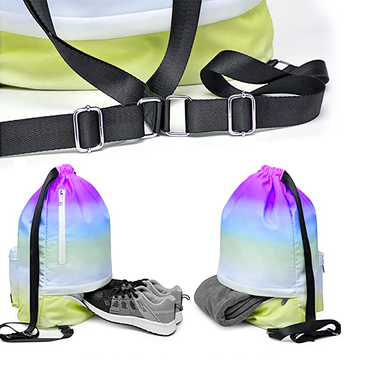 - This gym bag drawstring backpack is made of water resistant nylon and polyester, easy to clean, recyclable, water resistant, allowing you to put your towels and wet clothes in your swim bag without leaving behind. The fabric is blended with bright yarn for a more beautiful look.