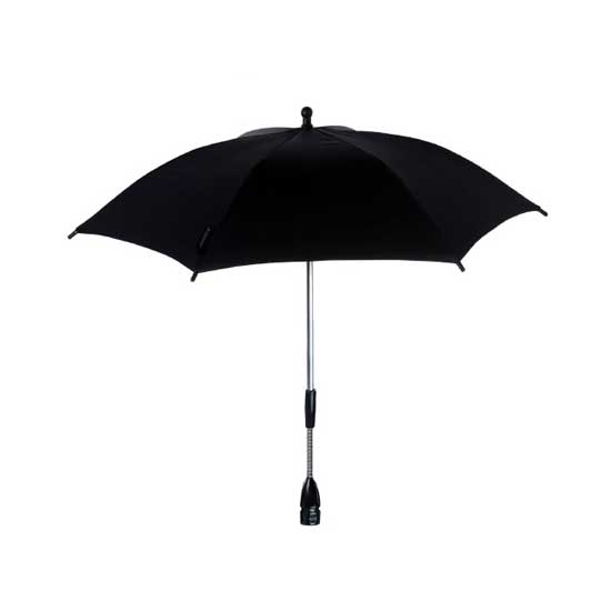 Displayed is a stroller parasol made of steel for durability and a light weight. With a smart design, this parasol can tilt at different angles for efficient protection. This stroller parasol can be used on many baby strollers.
