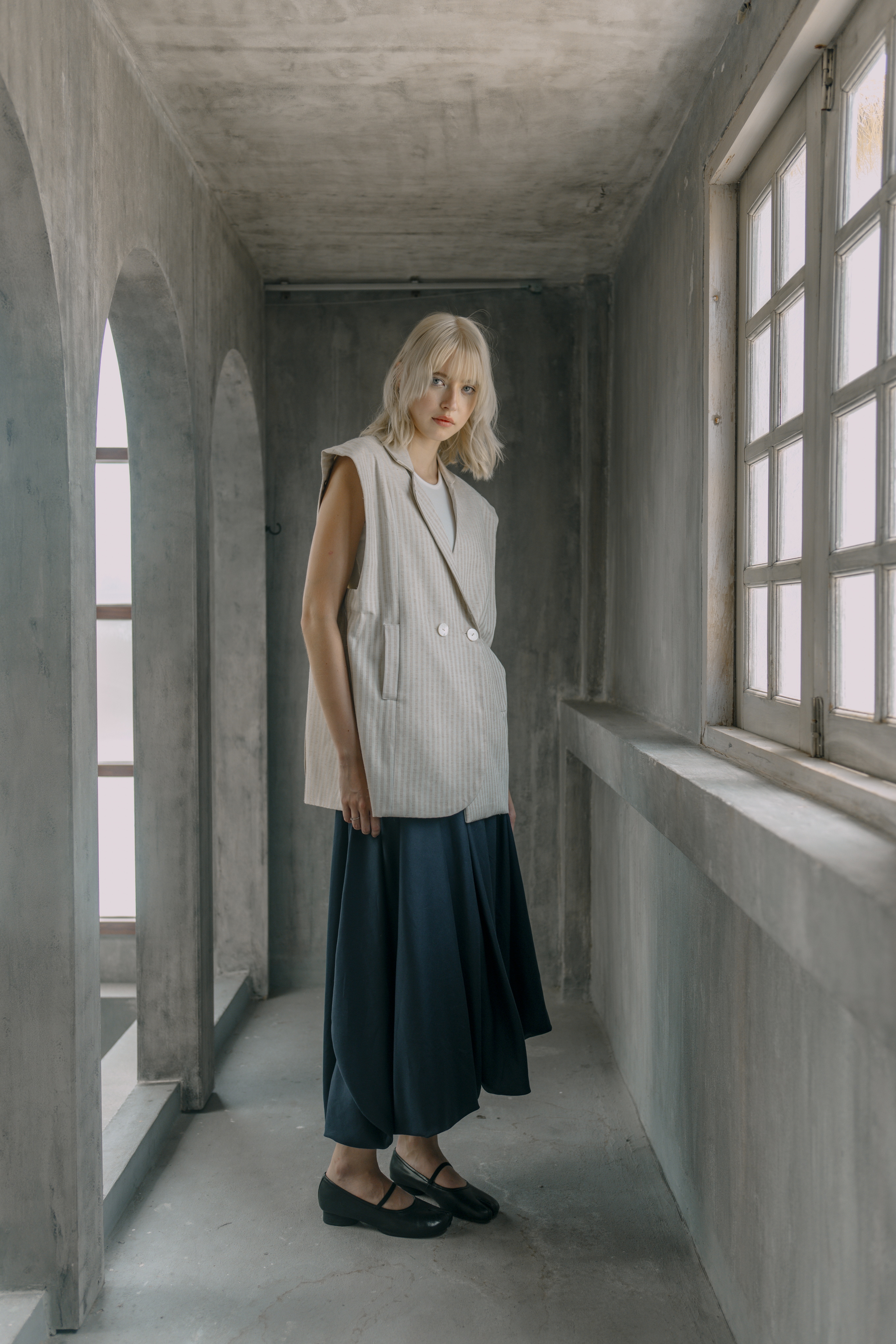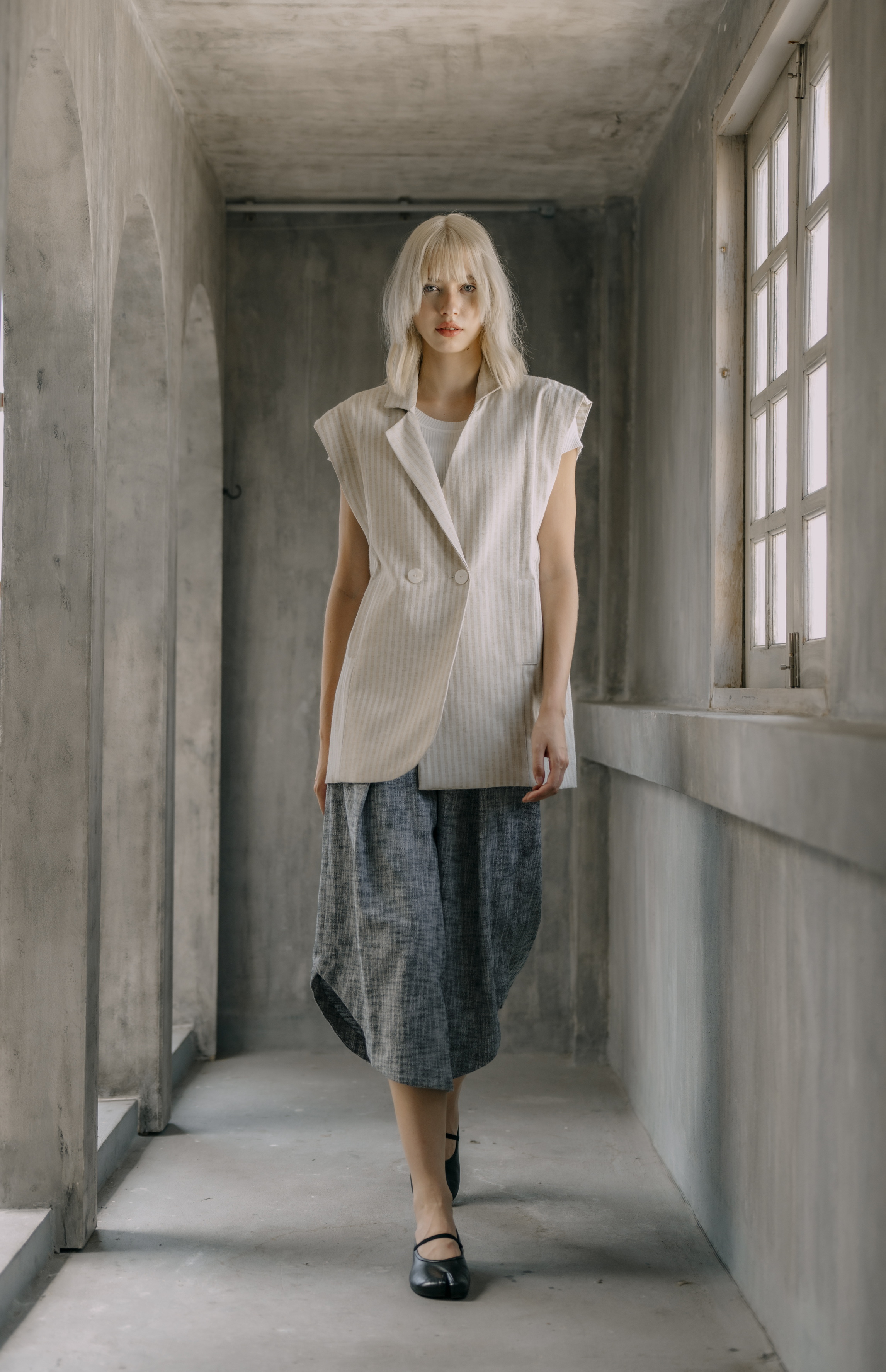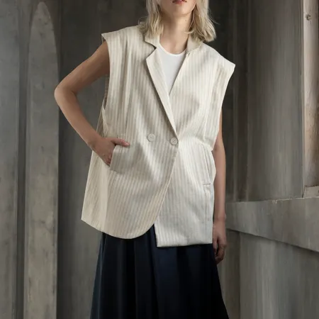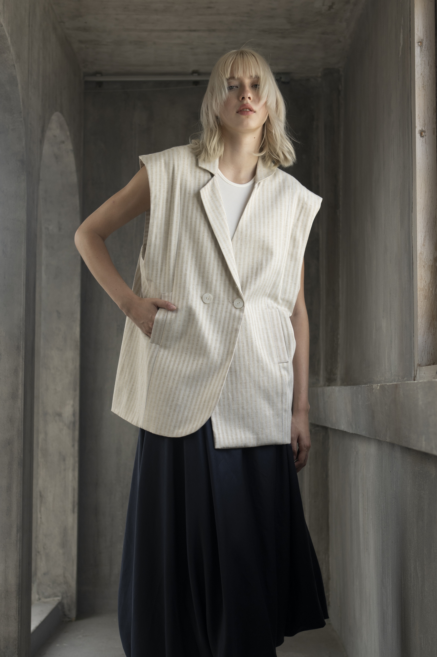 Structured sleeveless blazer crafted from recycled fabric blended with hemp fiber, finished with mother-of-pearl buttons.