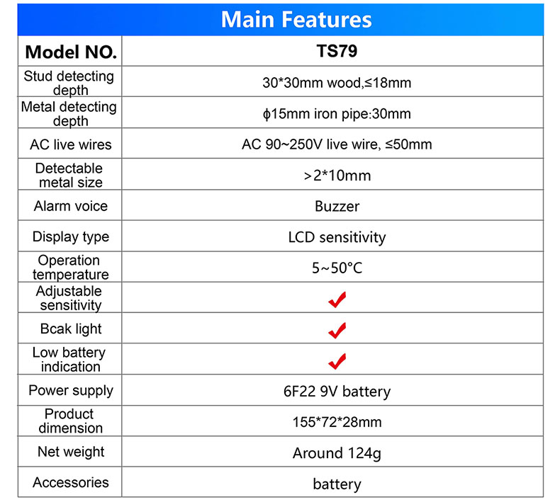Stud Finder Home Decoration 3 in 1 LCD Display AC Live Wires Metal Stud Detector TS79 Metal Detector Factory Direct Sale