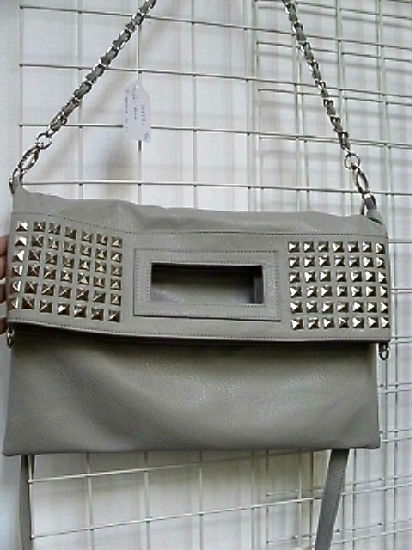 • Foldover PVC shoulder bag with studs.