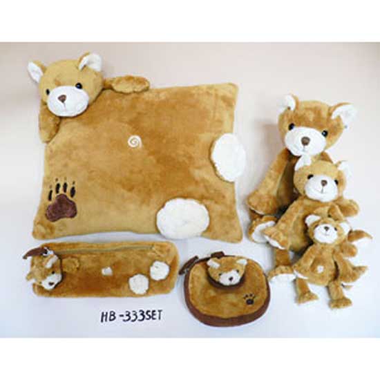 The set comprises stuffed toys, a coin bag, pencil bag and cushion. It is characterized by the adorable bear design. This stuffed bear set is a great gift for kids.