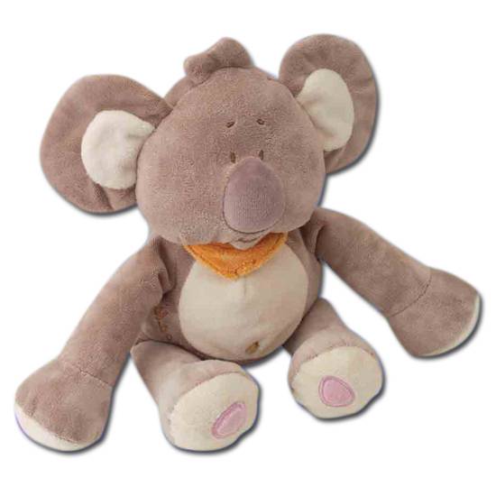 This baby Kiki Koala plush is made in the sitting position. The 20cm tall doll is a baby safe doll is colored in brown with a little scarf in orange. It is an perfect gift idea for families with new-born babies.