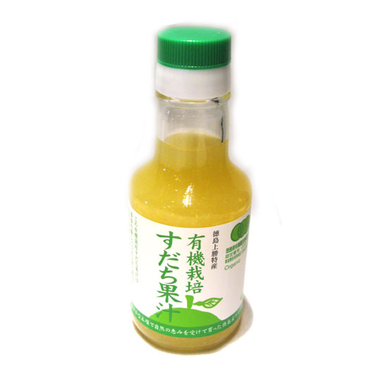 Displayed here is a bottle of organic Sudachi juice, a kind of citrus fruit juice, which is originated in Tokushima, Japan. It is reported that Sudachi helps lower glucose levels in diabetic patients. This organic Sudachi juice is an ideal beverage for health-conscious people.