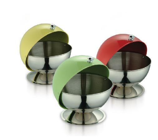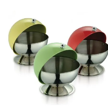 Made of stainless steel, this sugar bowl features a chic sphere shape design with its vividly colored powder coating top lid. The top lid is equipped with a handle for convenient opening and closure. This sugar bowl is also available in mirror finished models which showcases an elegant style.