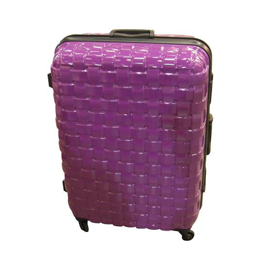 This is a purple coloured suitcase which is made of grerge nylon and and micro fibre PVC. The suitcase is equipped with 2 handles and 4 wheels.