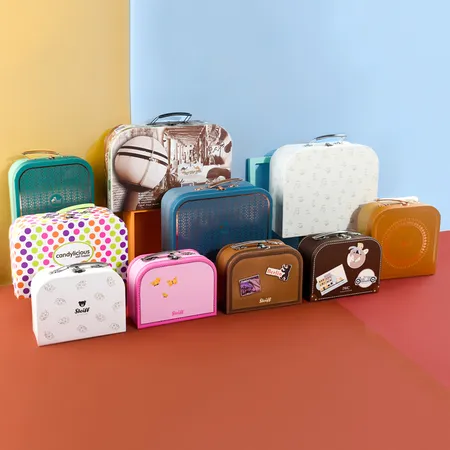 Mini suitcase boxes are widely used in the gift packaging field with the advantage of easy carrying and large storage, commonly seen in toddler clothes gift boxes, kid toy gift boxes, student stationery gift boxes, cosmetic gift boxes, cartoon gaming card boxes, etc. Styles of suitcase storage boxes can be varied from vintage, cute, fashionable, luxury, decorative and more.