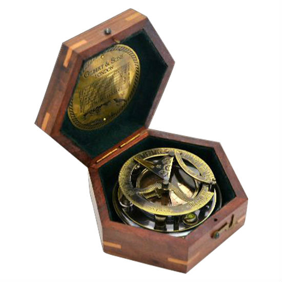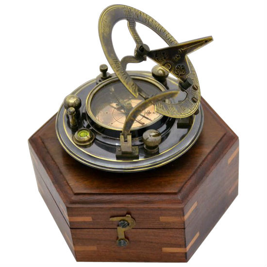 Indulge yourself in the realm of maritime history with this sundial compass in superb quality. Made with high quality brass, this item lends an antique vibe and makes a classy decoration. Lay the device down flat and keep it in the hexagonal sheesham wooden box, while you can just place the device on top of the box for a nice display.