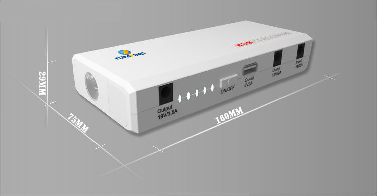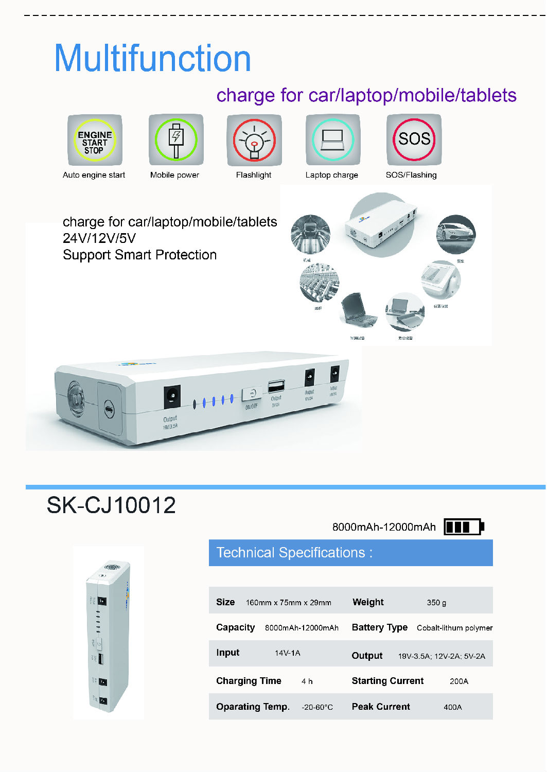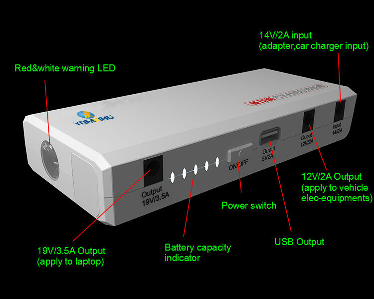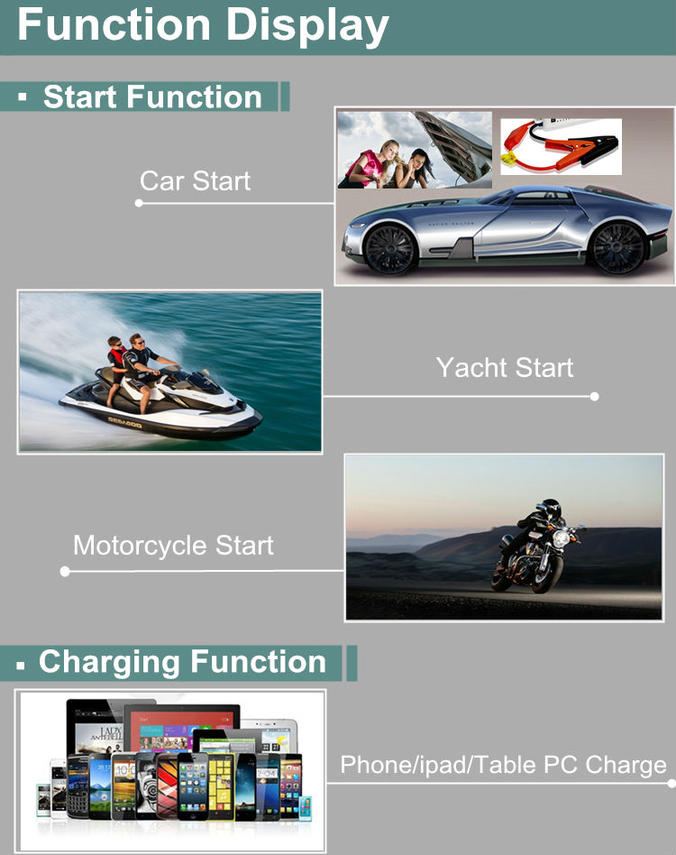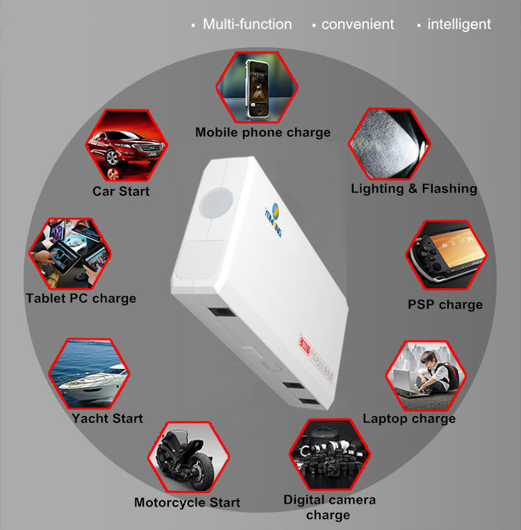 1.Charging for mobile phones and laptops, starting cars, adjustable LED lights (torch, strobe lights and SOS lights).
