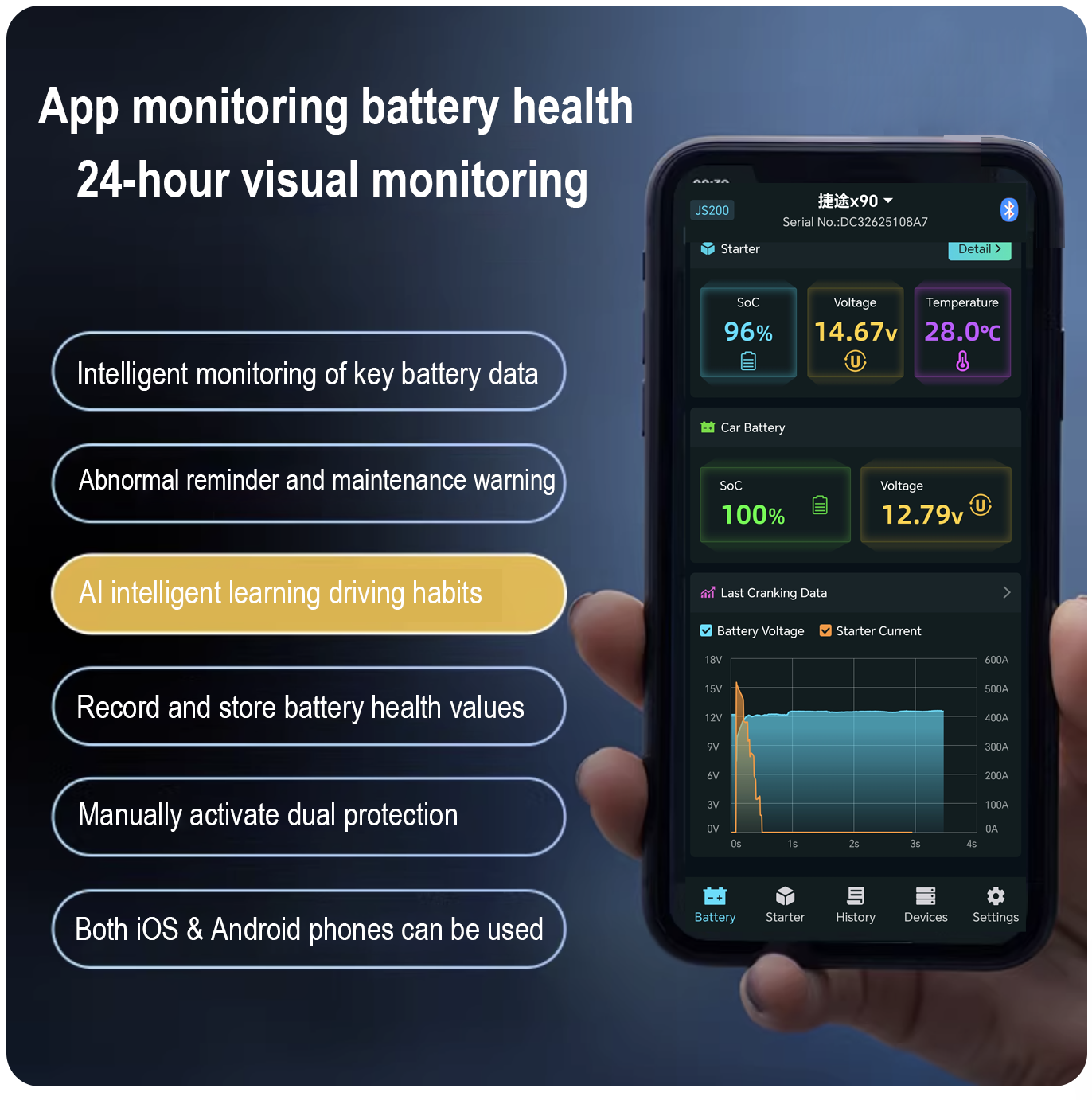 10. Smart App Monitor Real-time monitoring of key data of starter and battery. Full startup process records,including discharge curves and historical records.Automatically send alarms for abnormalities