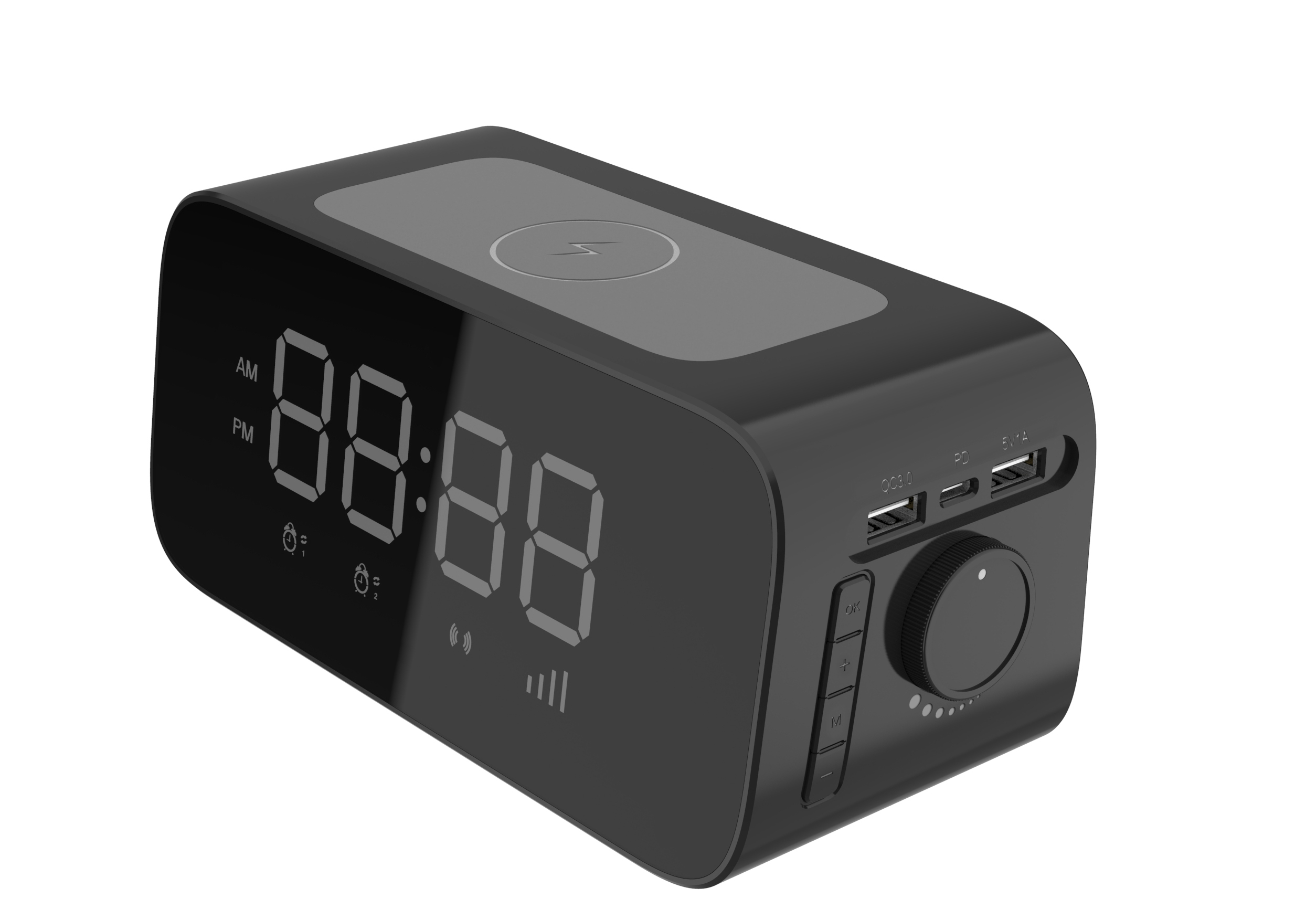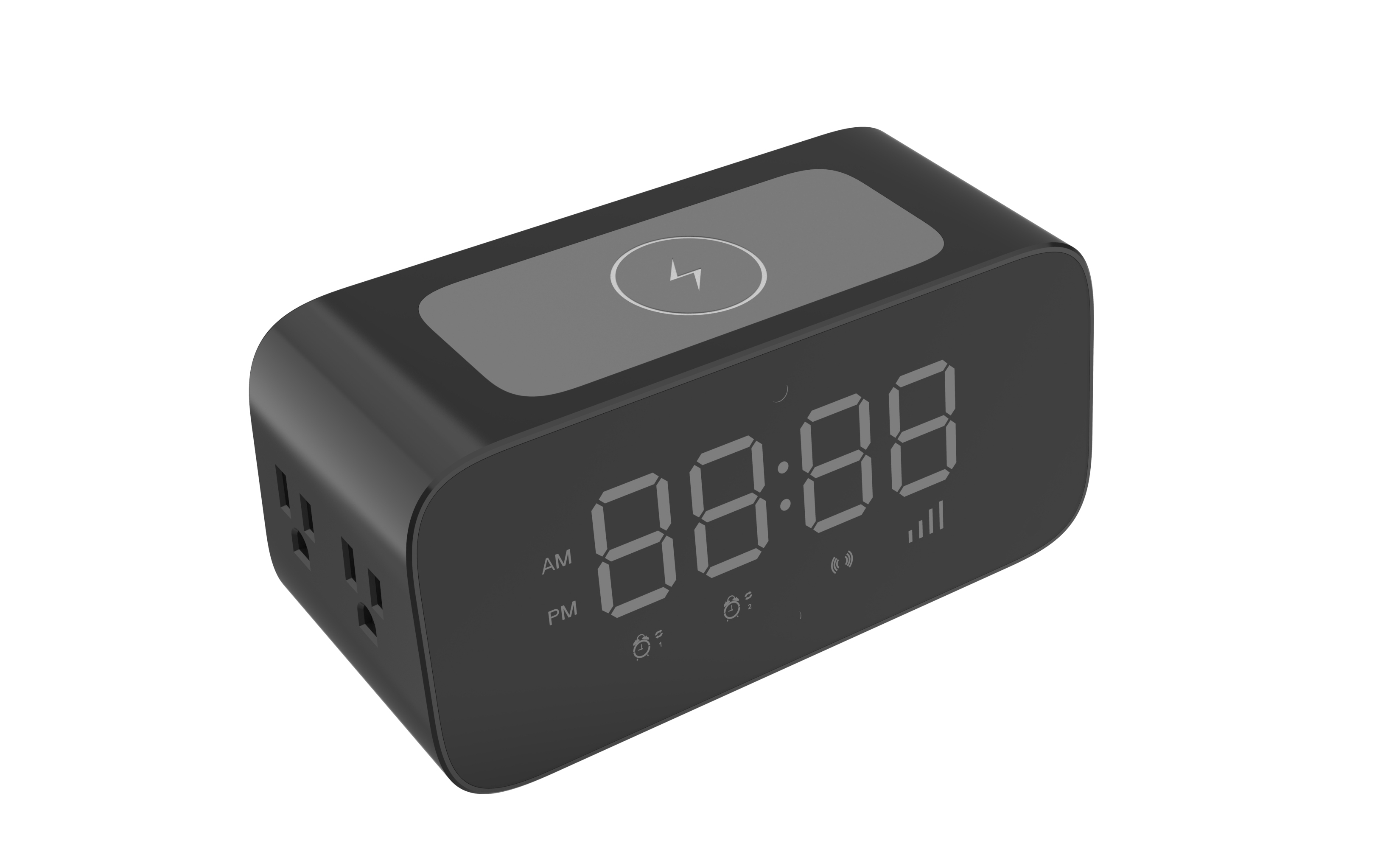 • Functions: two alarms, wireless and wired charging, AC outlet, clock & alarm