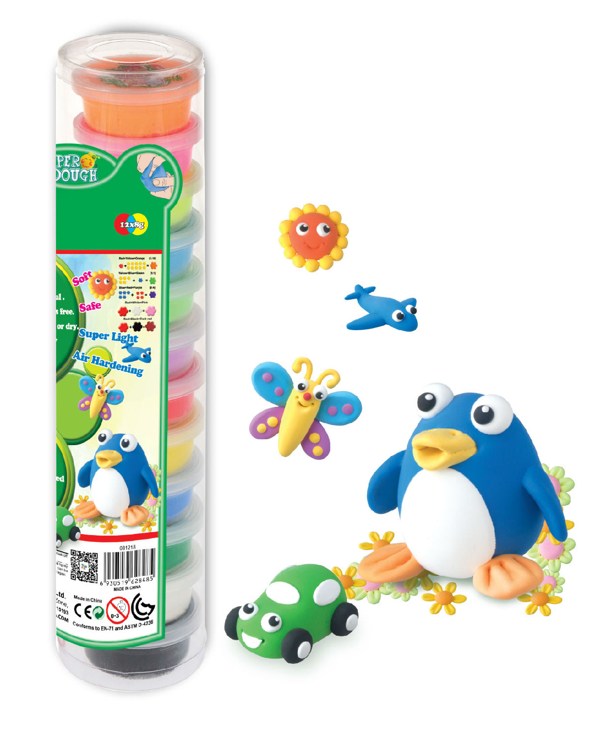 - 12 containers of modeling dough in different colors (8g).