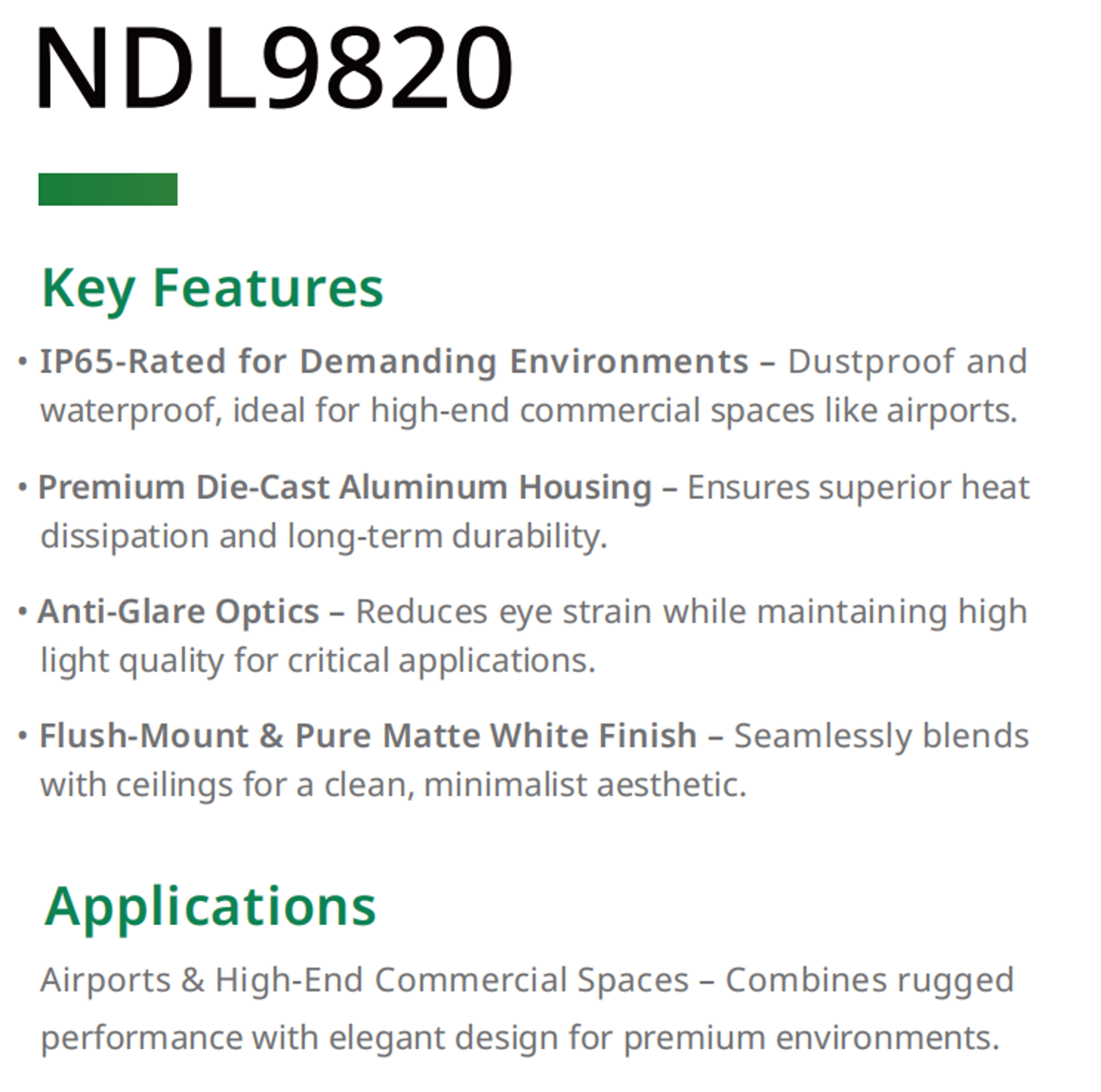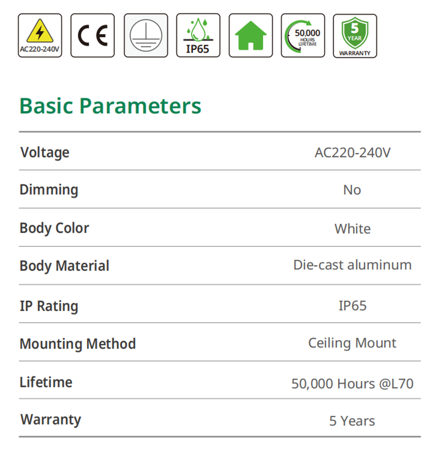 Premium Die-cut Aluminum housing with superior heat dissipation, IP65 rating for dustproof and waterproof, Anti-glare optics, Flush-mount & Pure Matte White Finish