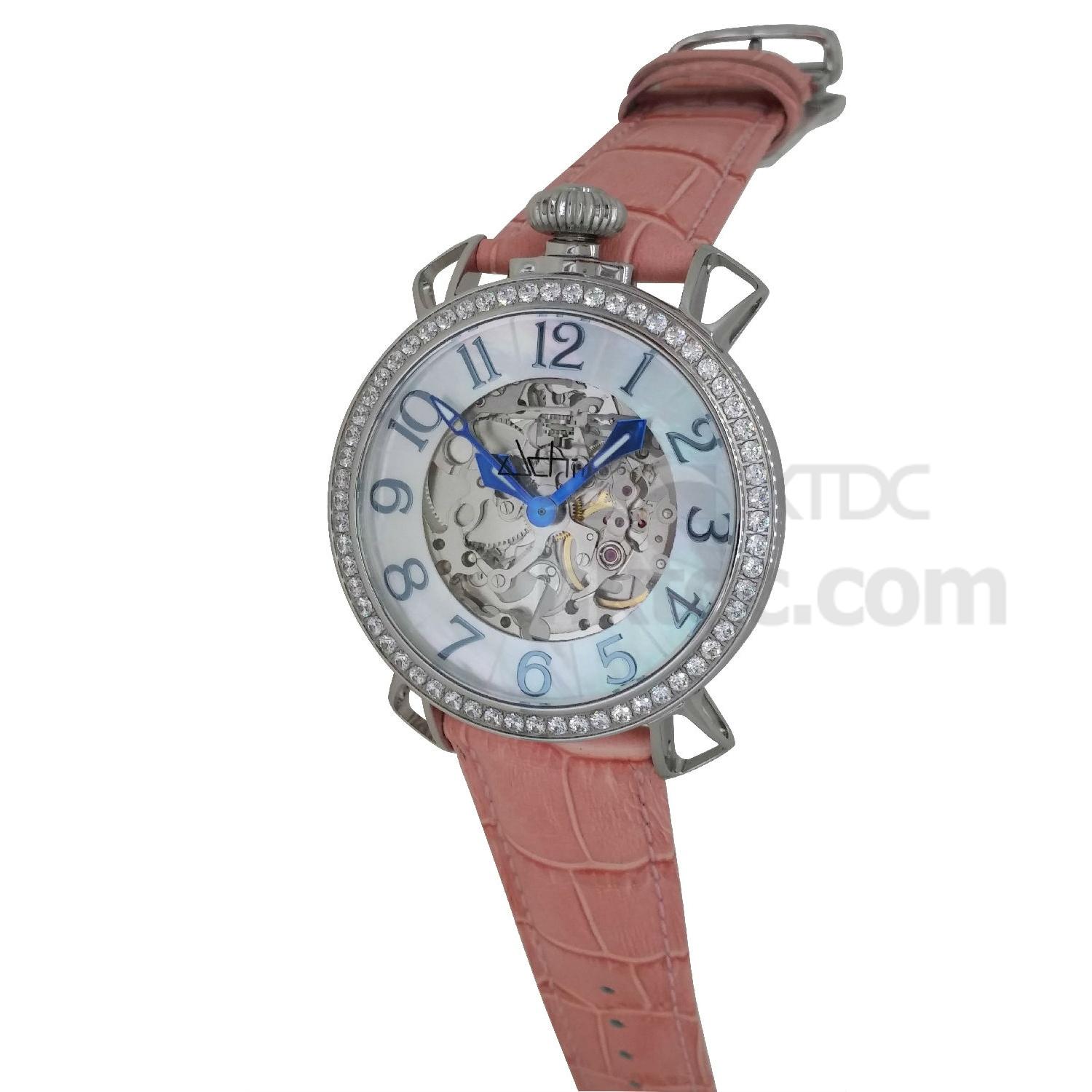 • Hollow 3-pin mechanical movement of 17 gems, coupled with mother pearl hollow figures.
