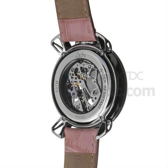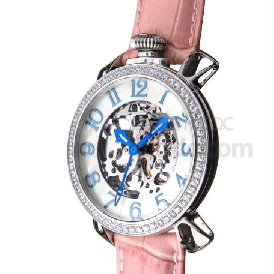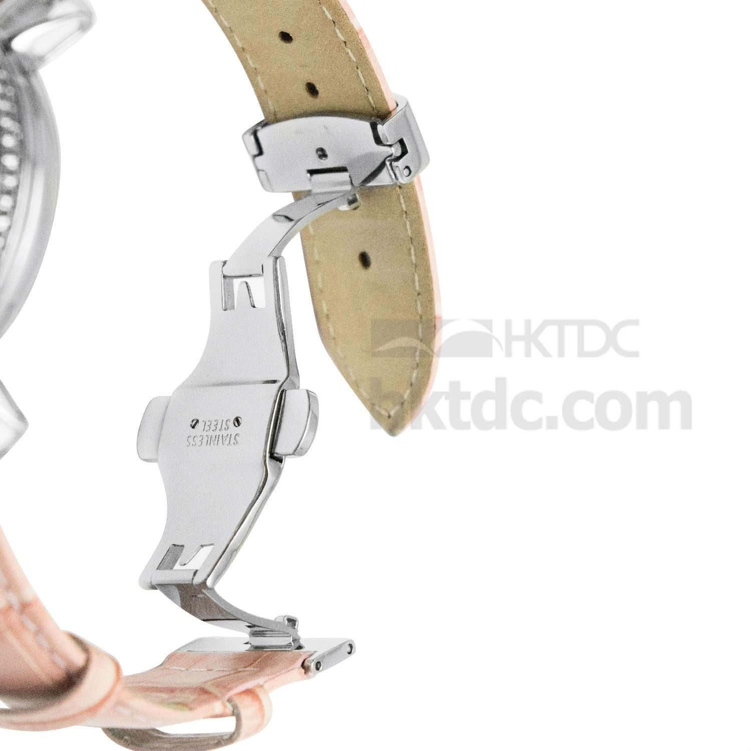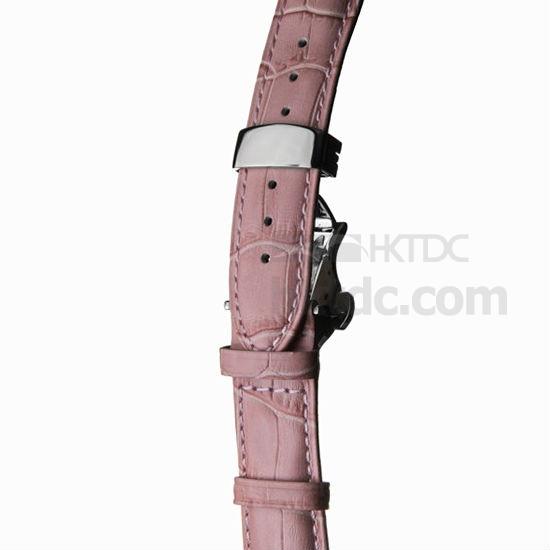 Transformable into a pocket watch, this leather watch marks stellar functionality and workmanship. With Swarovski crystals set along the bezel, this round polished case shines exceptional brilliance to express great class. This dial operates with 3 hands rotating across the Arabic numerals, powered by a mechanical caliber showcased via the hollow at the dial center.