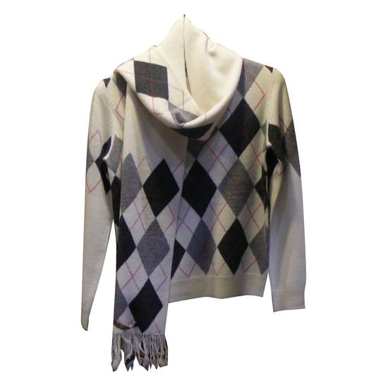 This is a set of ladies' sweater and muffler. It is made of 100% cashmere and features a rhombus pattern. It is soft and warm for wearing in winter and spring.