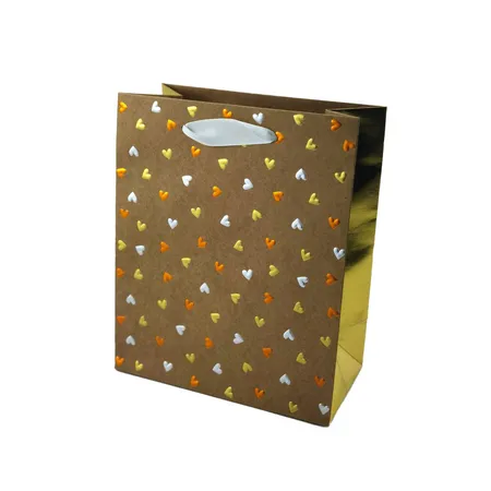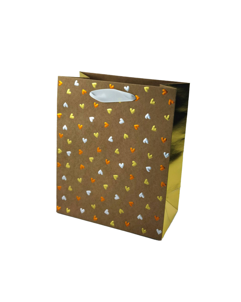 The surface of this gift bag is scattered with heart-shaped patterns in various colors. The gold stamping process is applied, presenting three colors of gold, silver, and copper. Although there are no elaborate patterns, it exudes a sense of simplicity yet sophistication. It is highly suitable for gift wrapping.