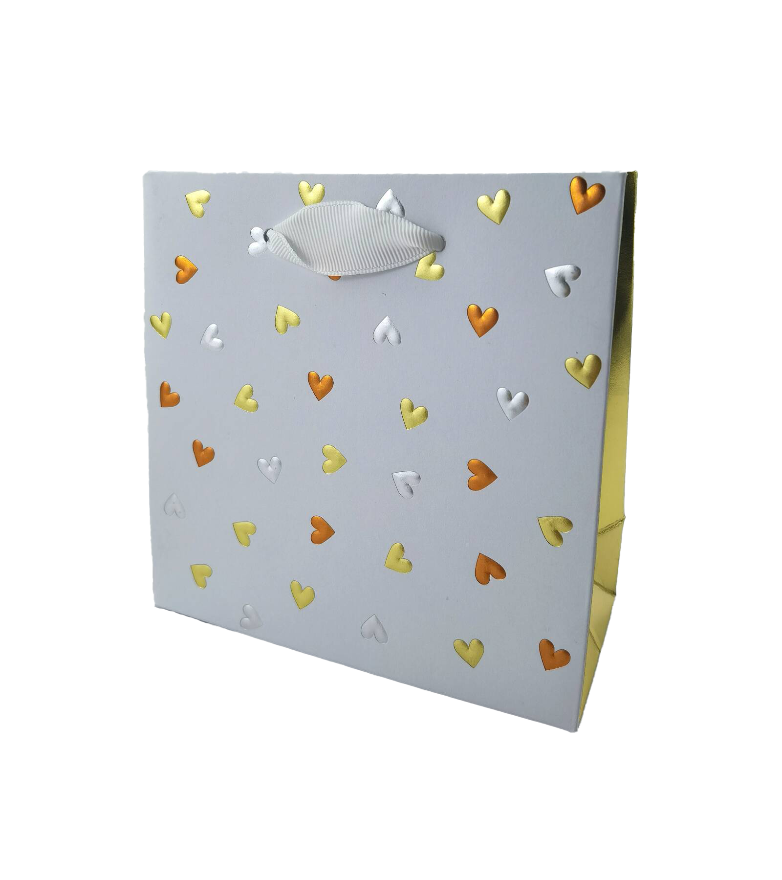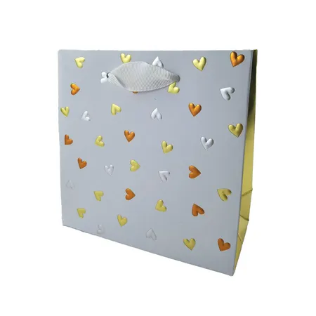 The surface of this gift bag is scattered with heart-shaped patterns in various colors. The gold stamping process is applied, presenting three colors of gold, silver, and copper. Although there are no elaborate patterns, it exudes a sense of simplicity yet sophistication. It is highly suitable for gift wrapping.