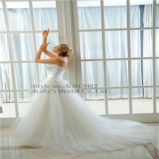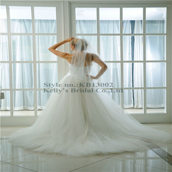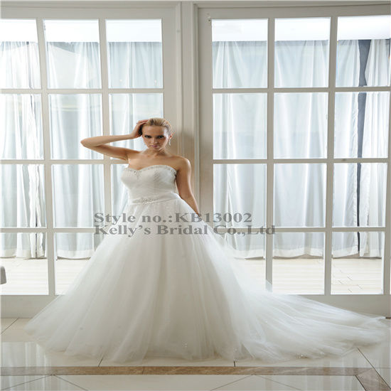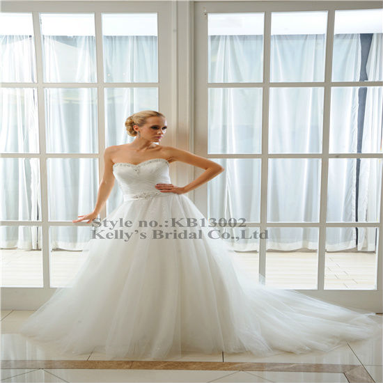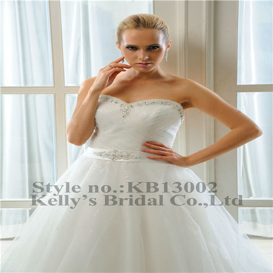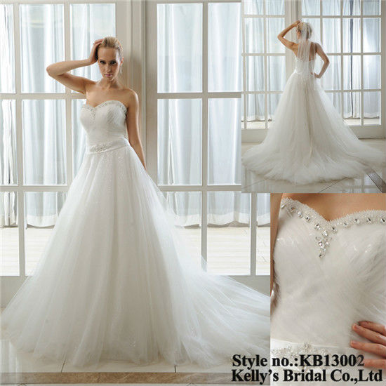Lovely sweetheart neckline with beading, lightly pleate in the top, there is a beaded belt as the decoration of the wedding dresses, and a long tulle veil.