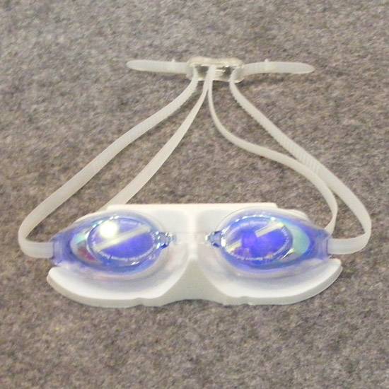 This is a pair of white coloured swimming googles which is made with adjustable elastic string and blue coloured google lens. The swimming googles can be taken off easily.