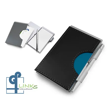 Jot down note pad on the go with this lightweight, durable "Field Pad" with pen and card holder, slim case in made from synthetic leather combine with aluminum, with a spring-loaded flip-open cover and holds a silver ballpoint pen that doubles as a latch and a 50-sheets notepad. It fits easily into a pocket, purse, or backpack, and make a great small gift.