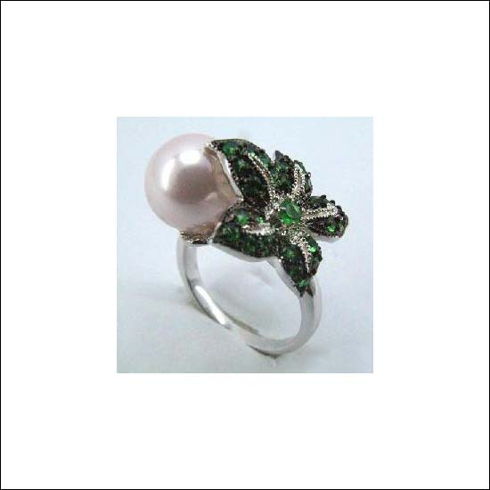 • A synthetic pearl ring with an opaque green gemstones in flowery shape