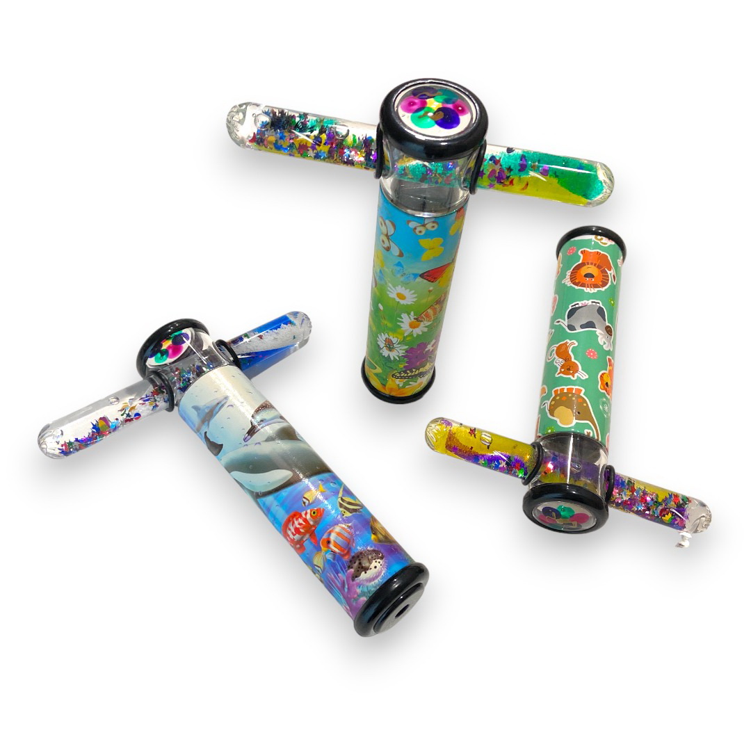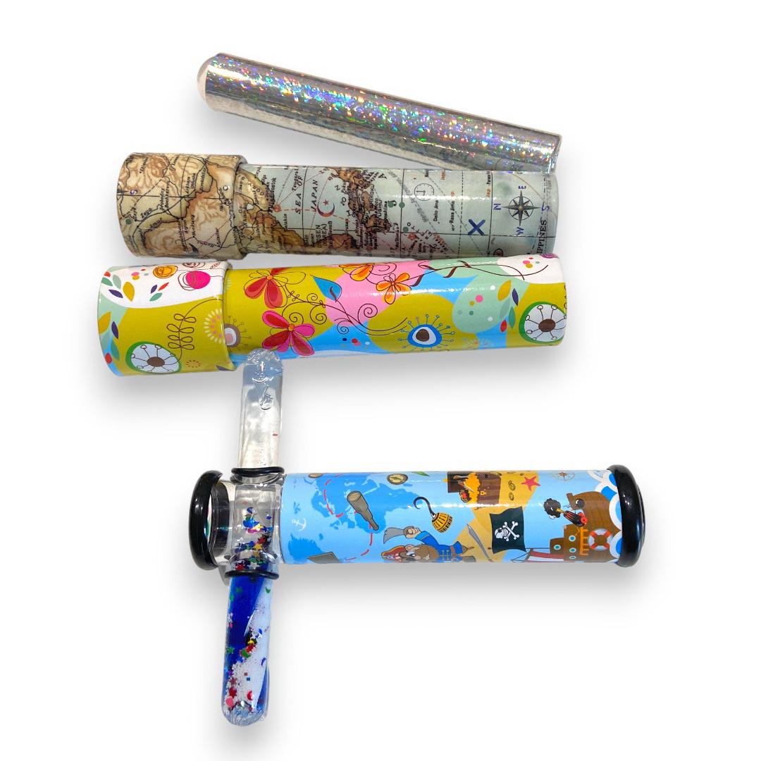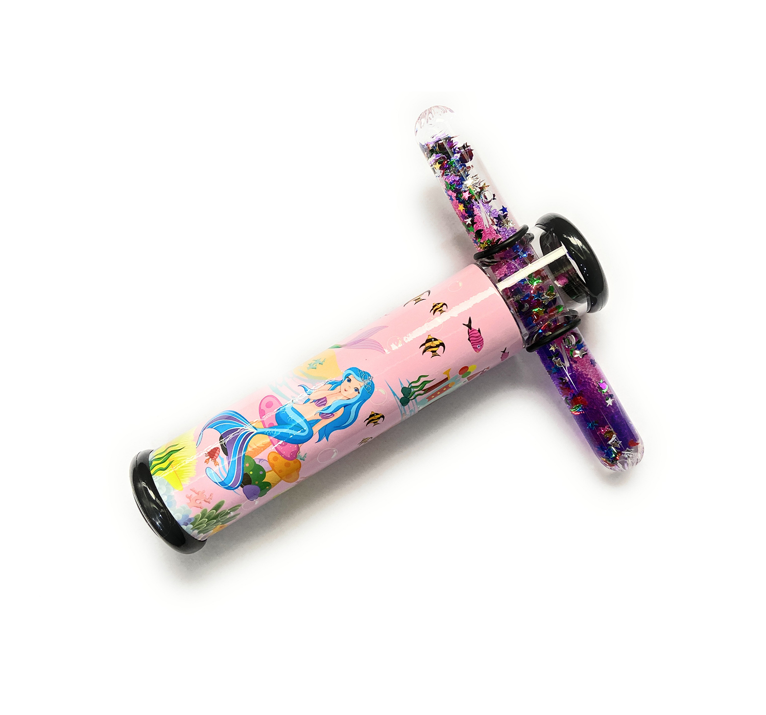 Each kaleidoscope features a beautifully printed paper tube paired with a liquid-filled glitter wand—available in 1-tone or 2-tone sand. As the wand flows, it creates a one-of-a-kind visual display through the viewing eyehole—like a slow-motion firework show you can hold in your hand.