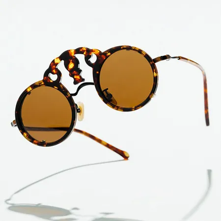 We extend the appearance of the traditional Japanese Tengu glasses into polarized front-mounted sunglasses clip-on. The base is a titanium 40mm perfect round frame, which can be used as daily optical wear. The Tengu-shaped clip-on is equipped with polarized lenses. The lens is put on the frame with a four-claw hook method. It has both practical and styling functions, and the overall weight is not too heavy. This model is available in four colors.