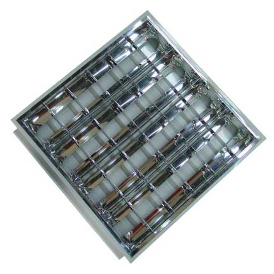 Displayed is a T8 light fixture which supports four 18W light tubes. It is assembled with a specular aluminum reflector and V-shaped aluminum blades. This piece also features built-in electronic ballasts of quality.
