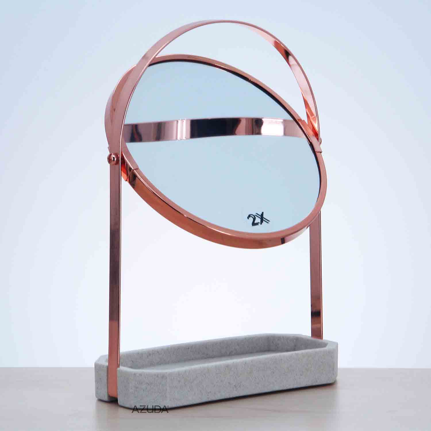 TABLE MIRROR (1X/2X)W/METAL FRAME IN ROSE GOLD PLATED SANDSTONE TRAY BASE