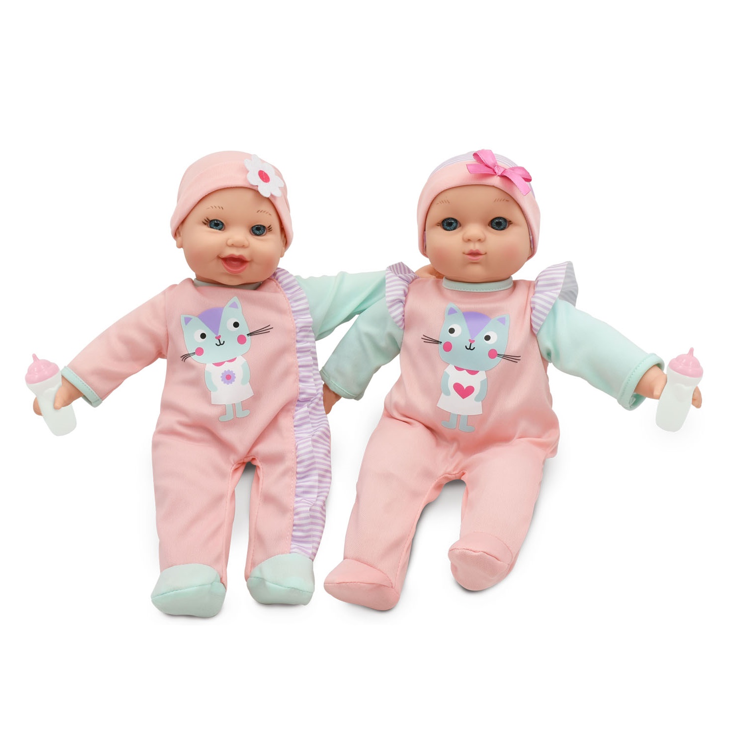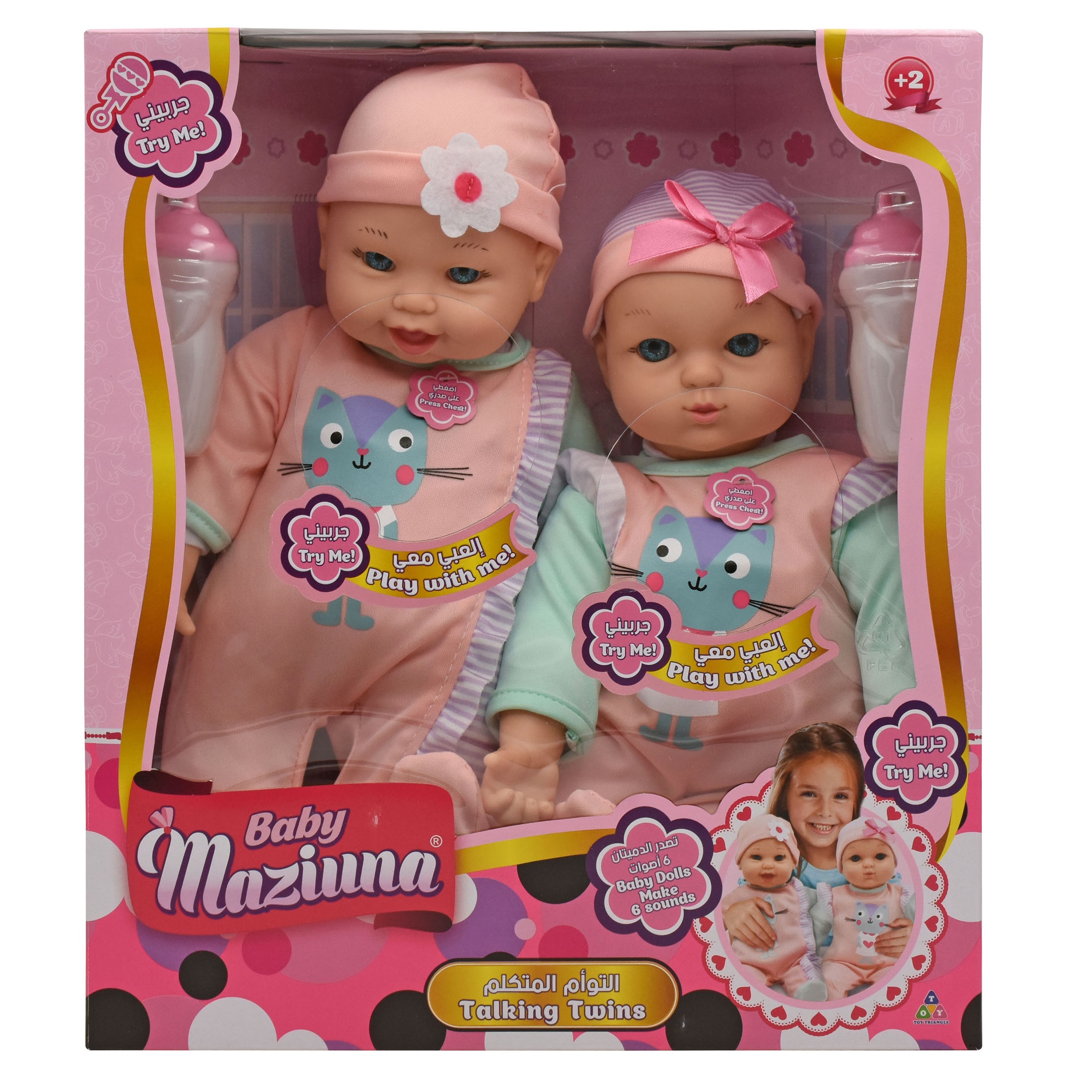 Each package includes 2x13.5" talking dolls and 2x milk bottles.