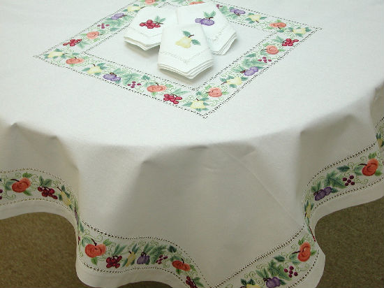 • Linen tablecloth with beautiful assortments of colourful fruits with matching napkins, 100% hand-embroidered.