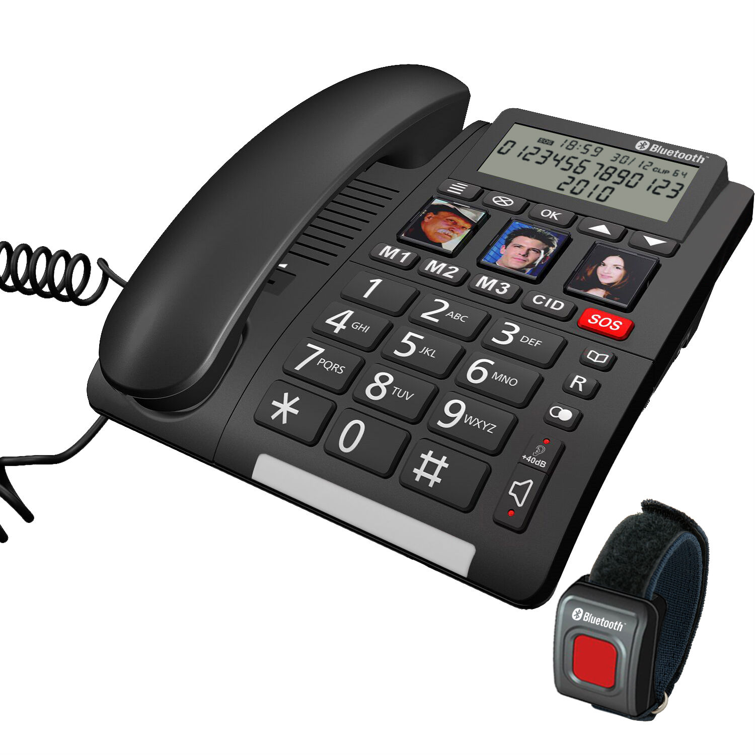 Water Proof remote SOS emergency pendant,BT v4.0 technology Pre-recorded or User recordable emergency OGM 6 LCD Display languages and voice prompt languages Loud ringer +40dB Amplification booster 3 x one touch photo key dialing 3 x one touch memory dialing FSK / DTMF dual mode Talking caller ID ETS 300381 preferred range HAC 2-way speaker phone with LED indication Shaker outlet