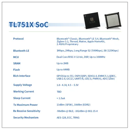 The TL751x supports standards and industrial alliance specifications including Bluetooth 5.4 Basic Rate (BR), Enhanced Data Rate (EDR), Low Energy (LE), Channel Sounding, indoor positioning and Bluetooth LE Mesh, Zigbee, HomeKit, Thread and 2.4 GHz proprietary standard.