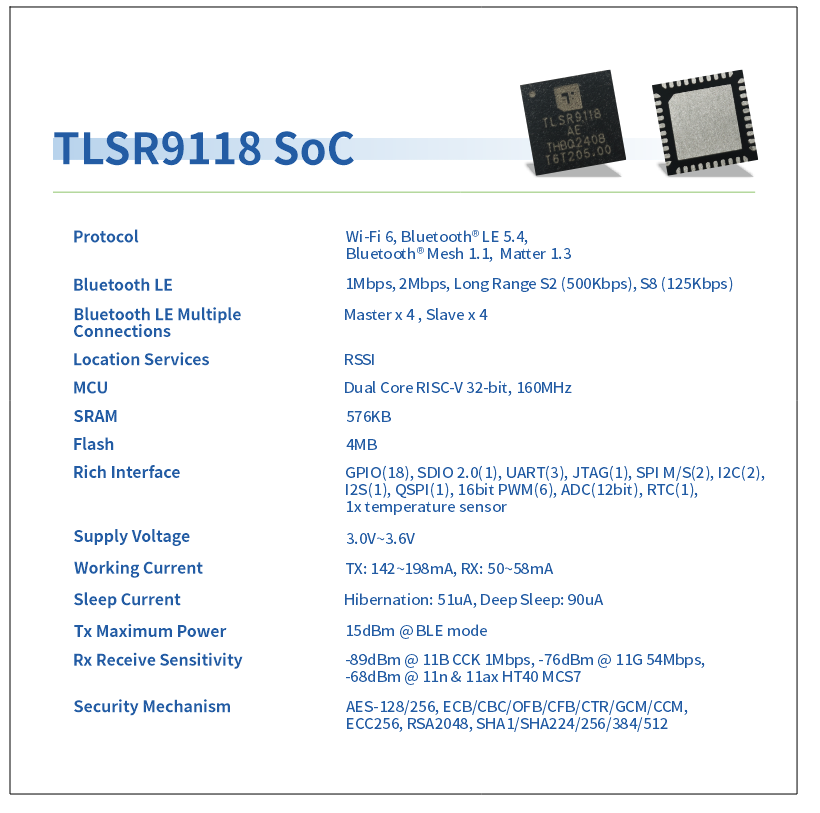 The TLSR9118 is a highly integrated 1T1R Wi-Fi 6 + Bluetooth LE 5.4 + IEEE 802.15.4 multi-standard wireless and MCU-based SoC solution for ultra-low-power and low-cost IoT application.