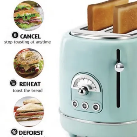 2 SLICE -TOASTER Metal housing with normal painting finishing; Heating with 6 time setting; Cancel/reheat/defrost function with indicator light; Bread centered function; Removeable crumb tray; Anti-slip feet design; Auto-electric power cut off function