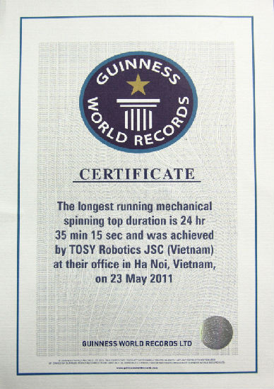 - A special version of TOSY TOOP has been certified by the Guinness world records as the world’s longest-running mechanical spinning top with non-stop spinning time of 24 hours 35 minutes 15 seconds.