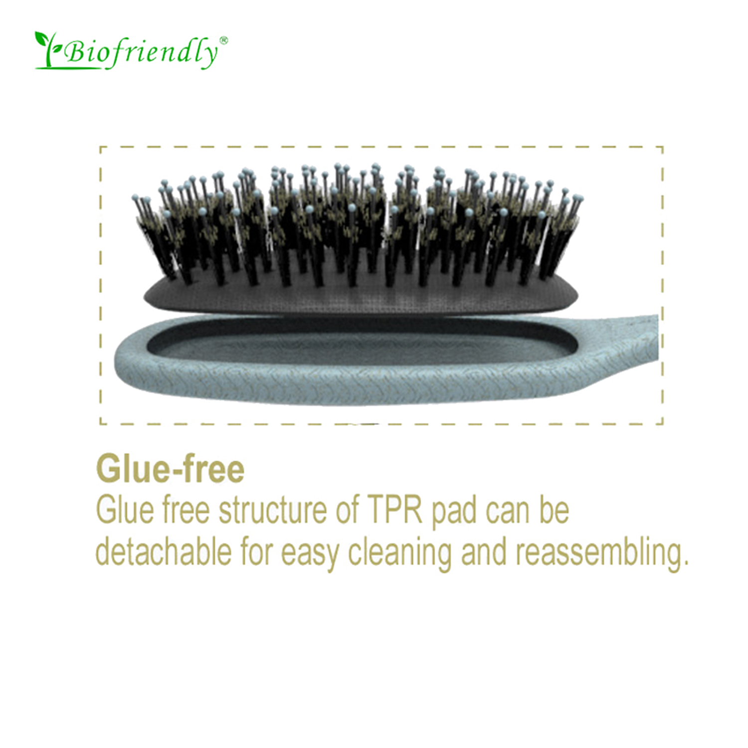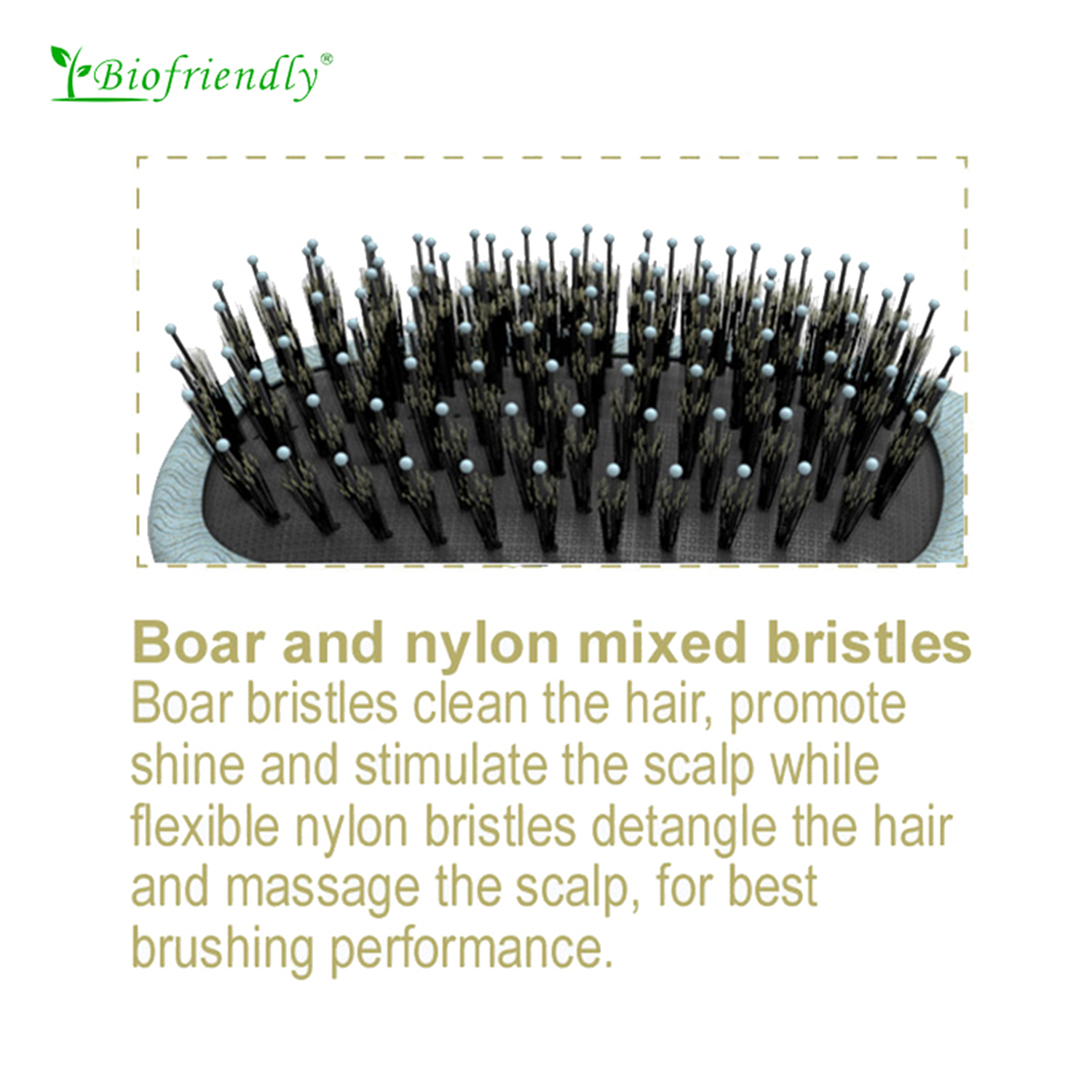 •Boar bristles clean the hair ,promote shine and stimulate the scalp while flexible nylon bristles detangle the hair and massgage the scalp for best brushing performance
