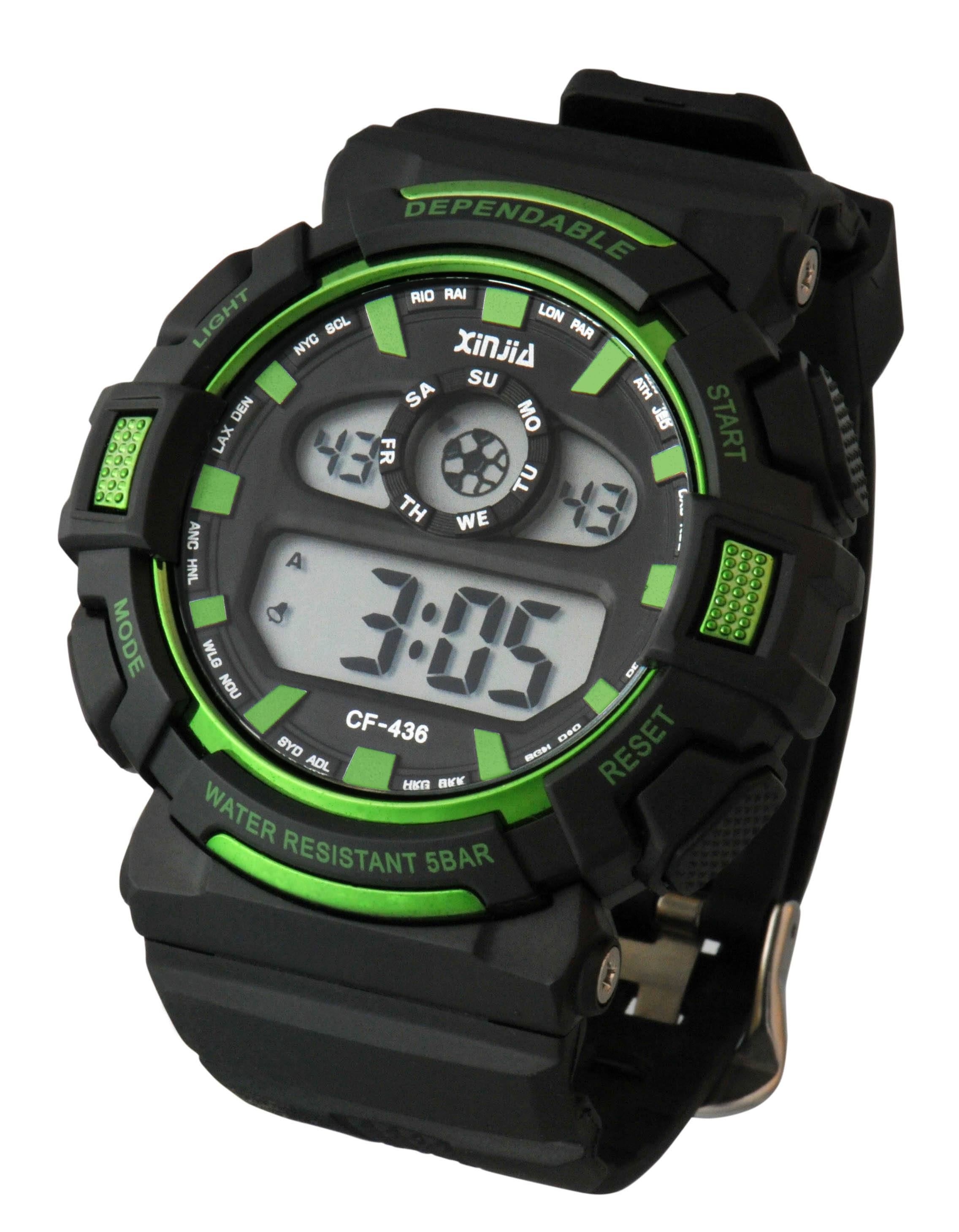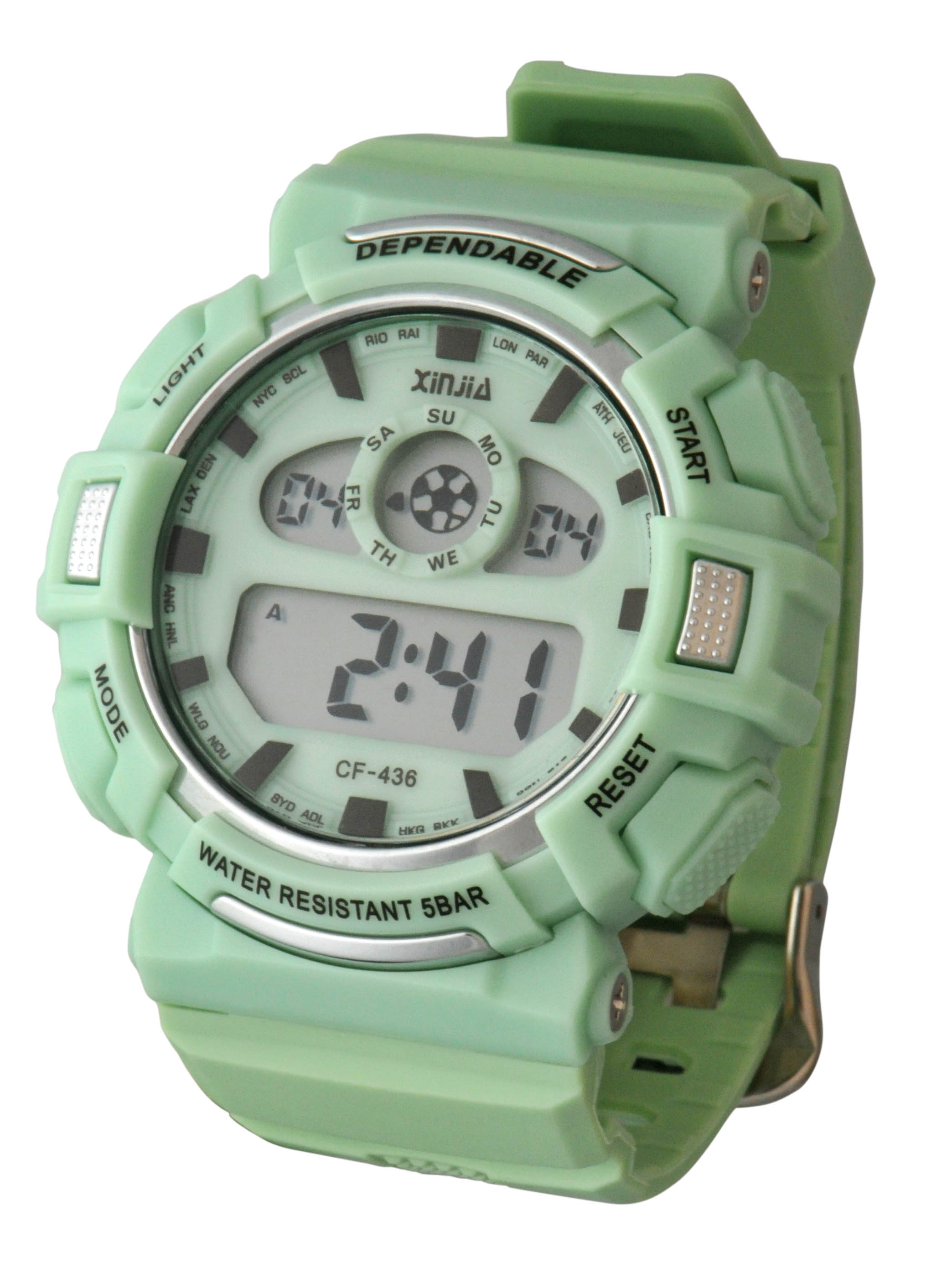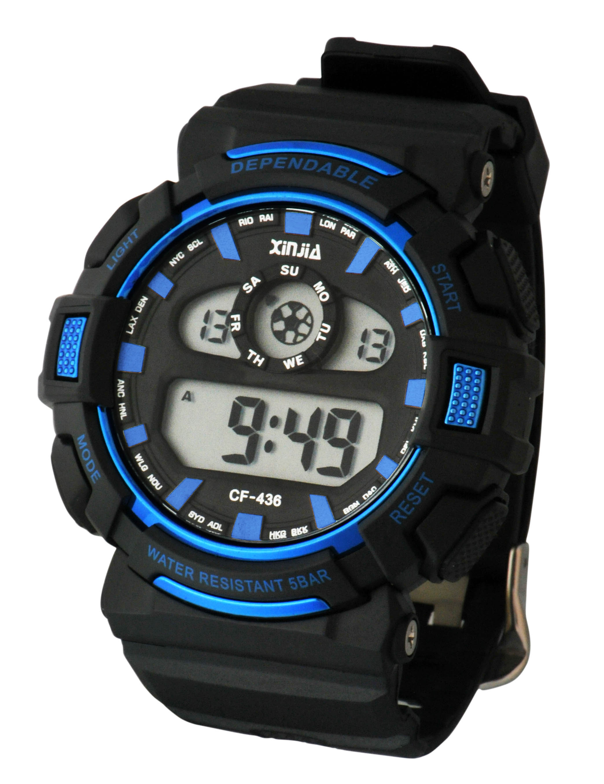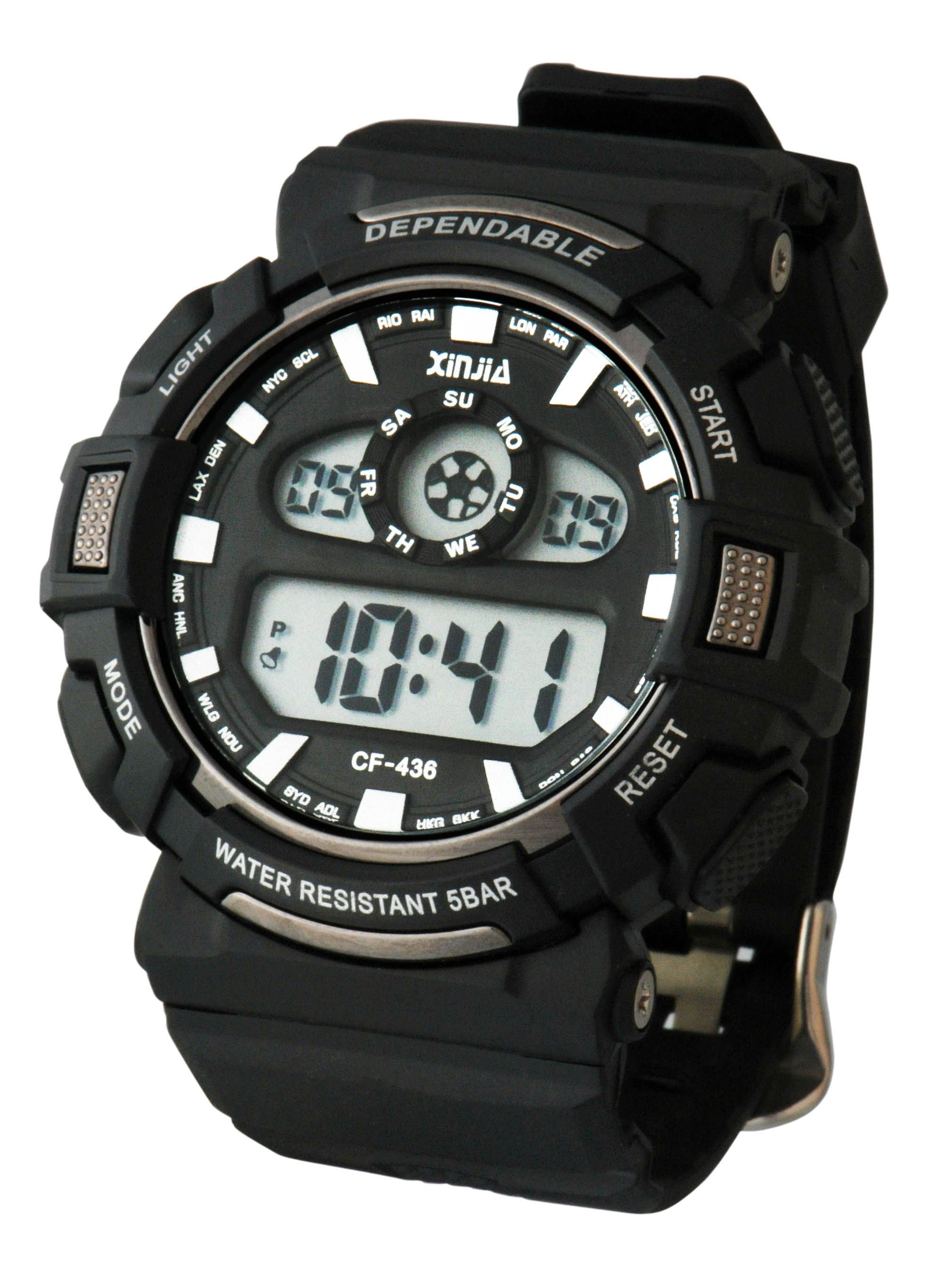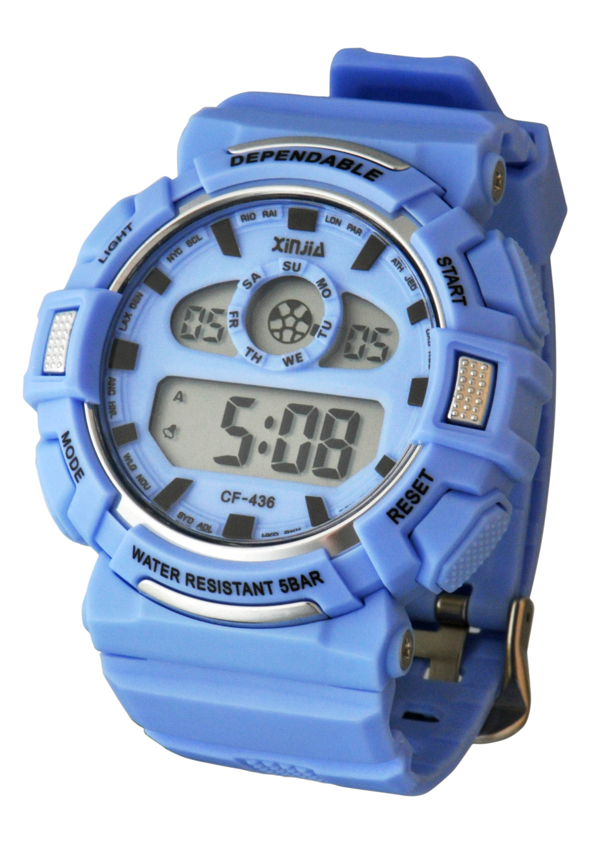 This sports watch provides digital time display and provides time, date, week, stopwatch and alarm function. It is equipped with a EL-lamp for easy reading and has an adjustable TPU resin strap for comfortable wearing. The digital sports watch is powered by alkaline batteries and delivers accurate and reliable performance.