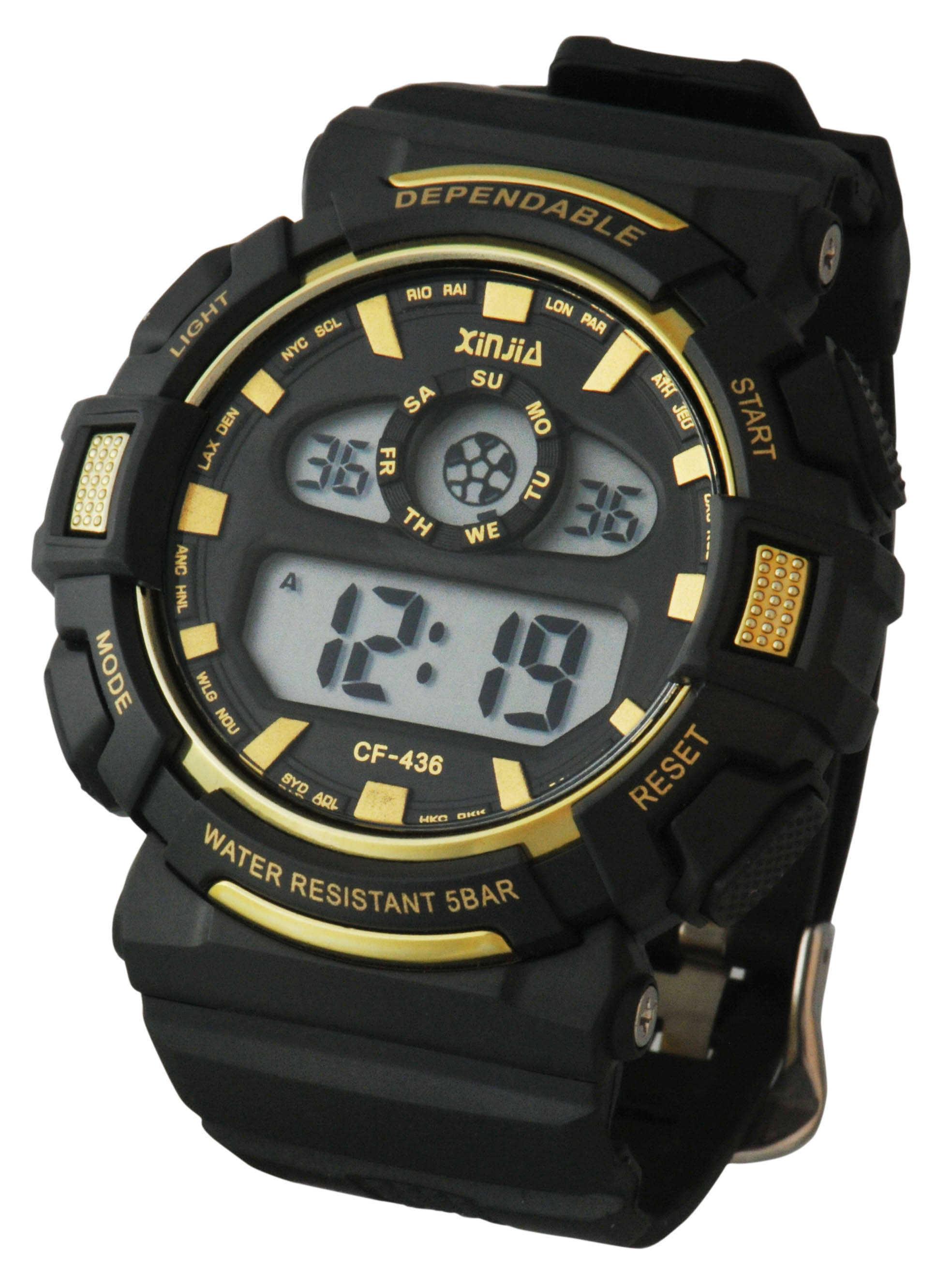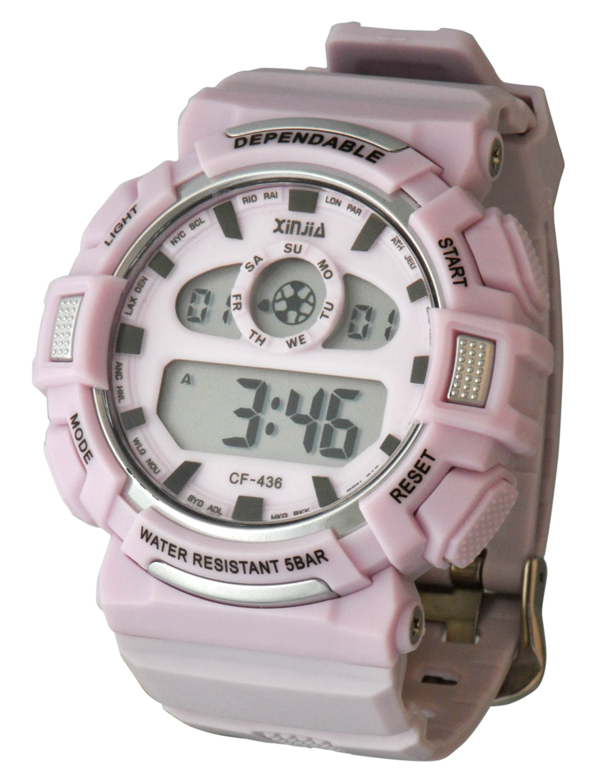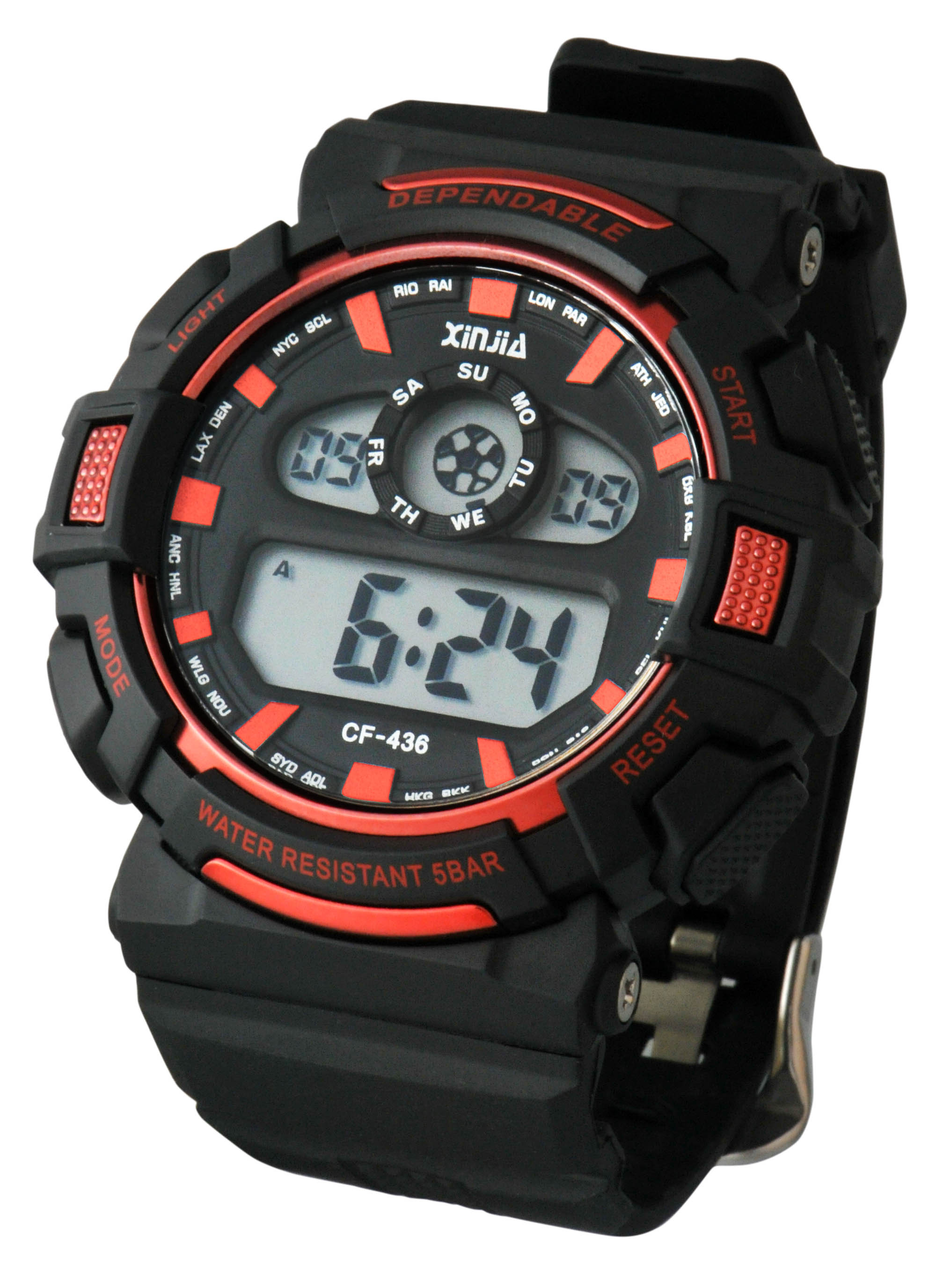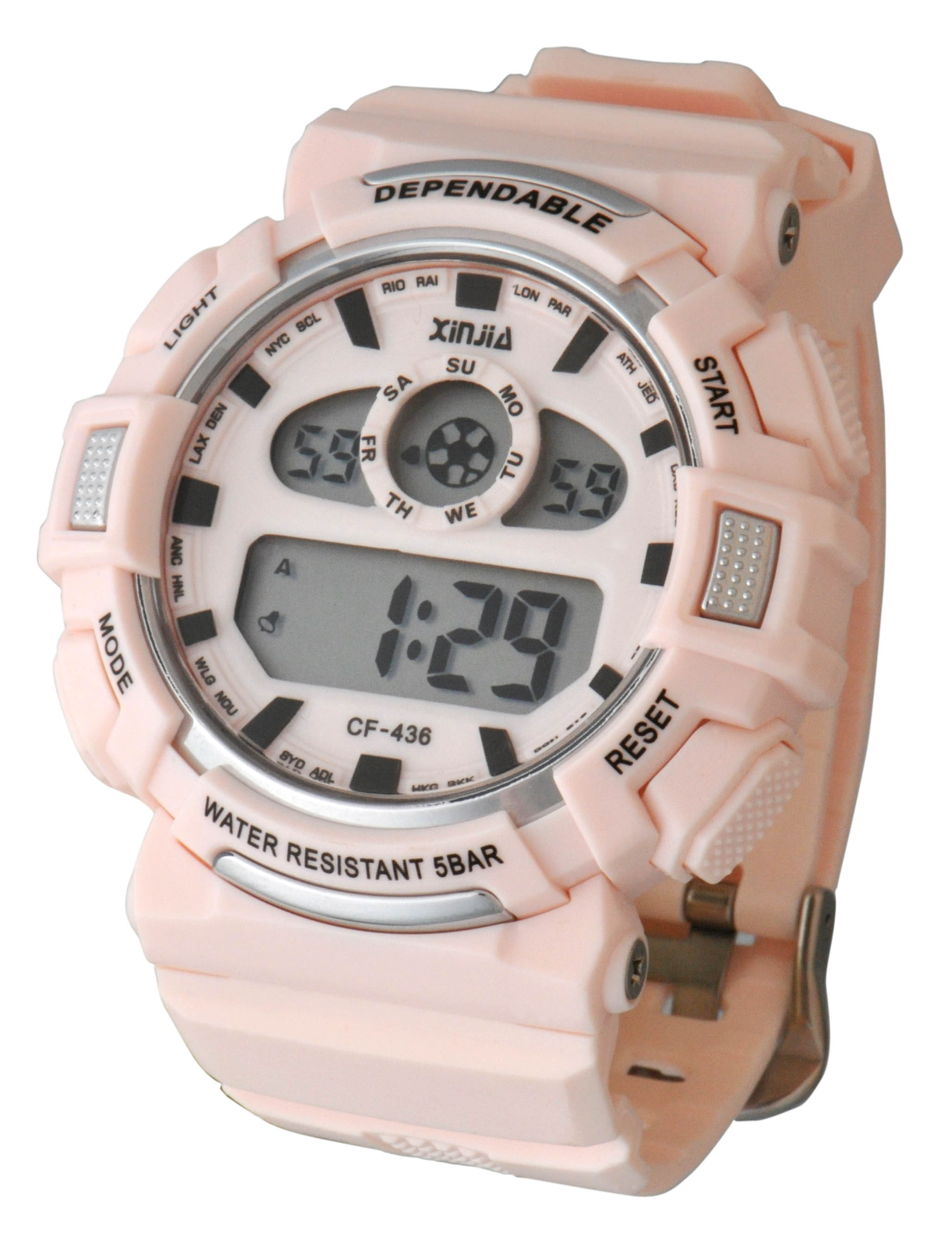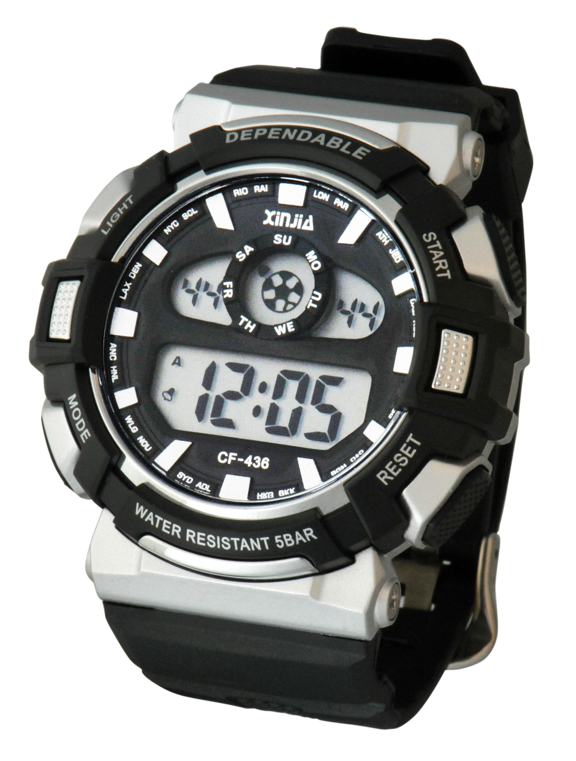 This sports watch provides digital time display and provides time, date, week, stopwatch and alarm function. It is equipped with a EL-lamp for easy reading and has an adjustable TPU resin strap for comfortable wearing. The digital sports watch is powered by alkaline batteries and delivers accurate and reliable performance.