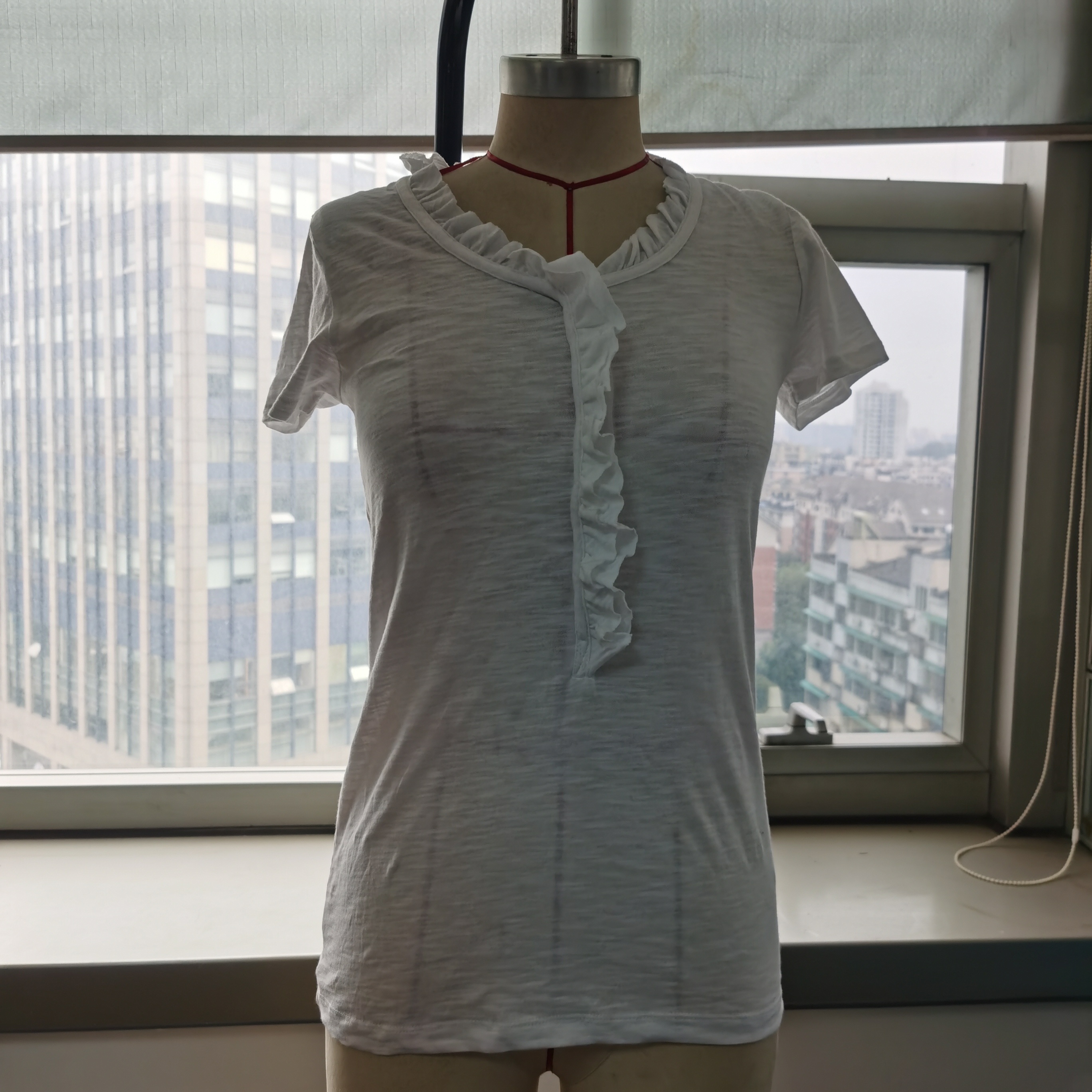 100% bamboo cotton. With Soft handfeel and ruffle collar and placket.