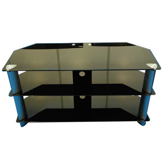 The TV stand can accommodate most flat panels of up to 50". It features a tempered glass top with middle and bottom shelves. This TV stand is sturdily built for excellent strength and durability.