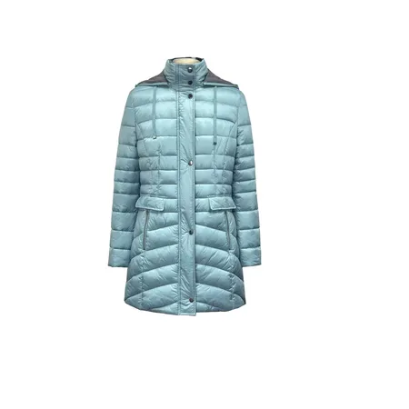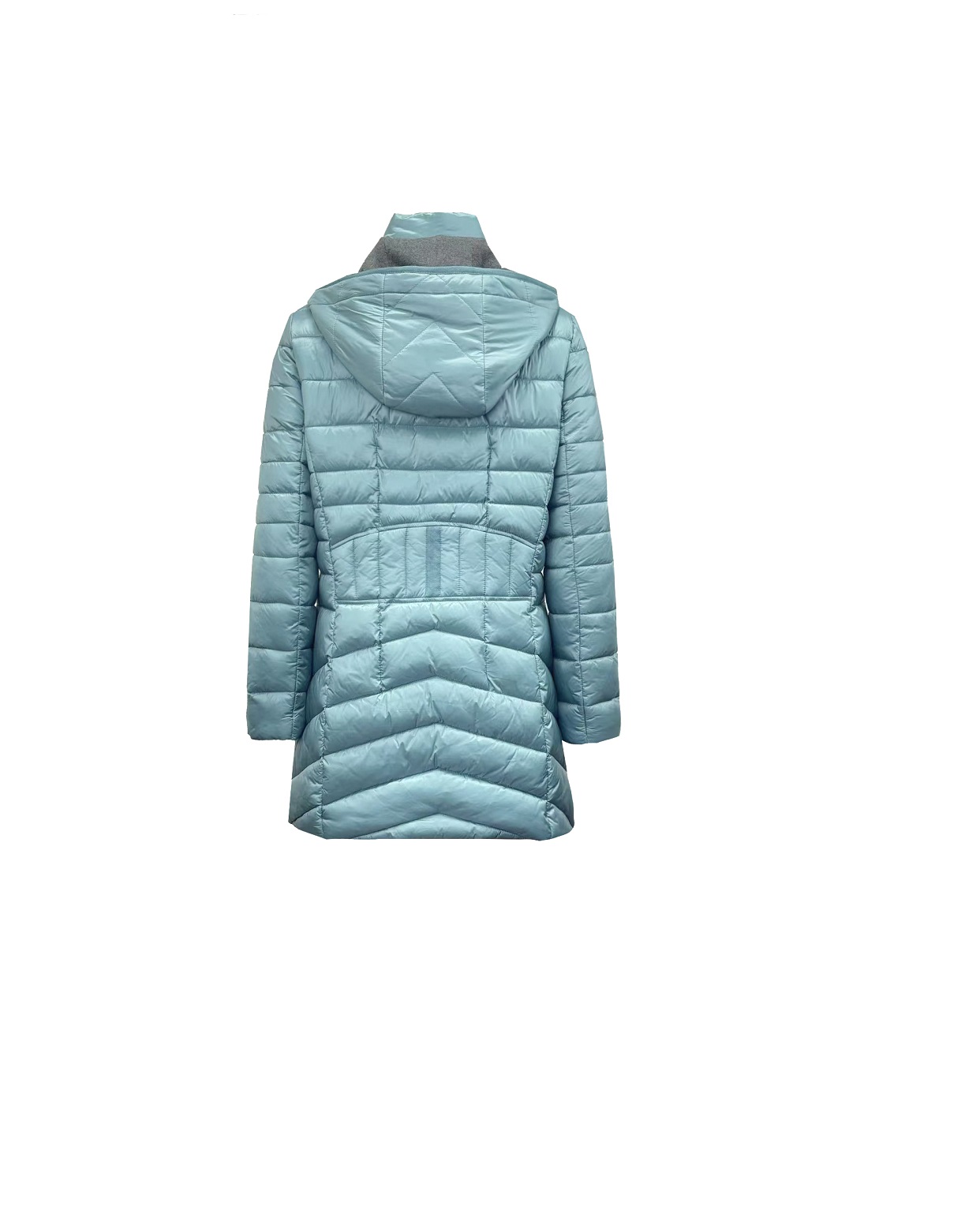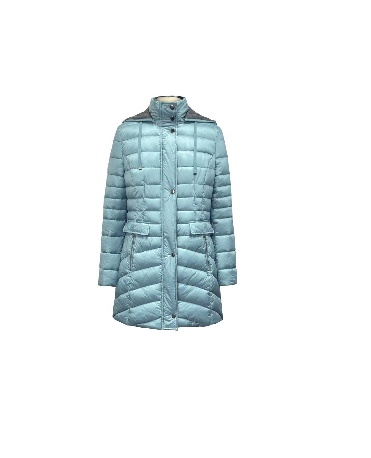 Ladies’ quilted jacket w/ detachable hood; stand-up collar; CF closed with zipper and snaps; waist zipper pocket with decorative pocket flap, inside collar ane hood to be contrase peach fabric.