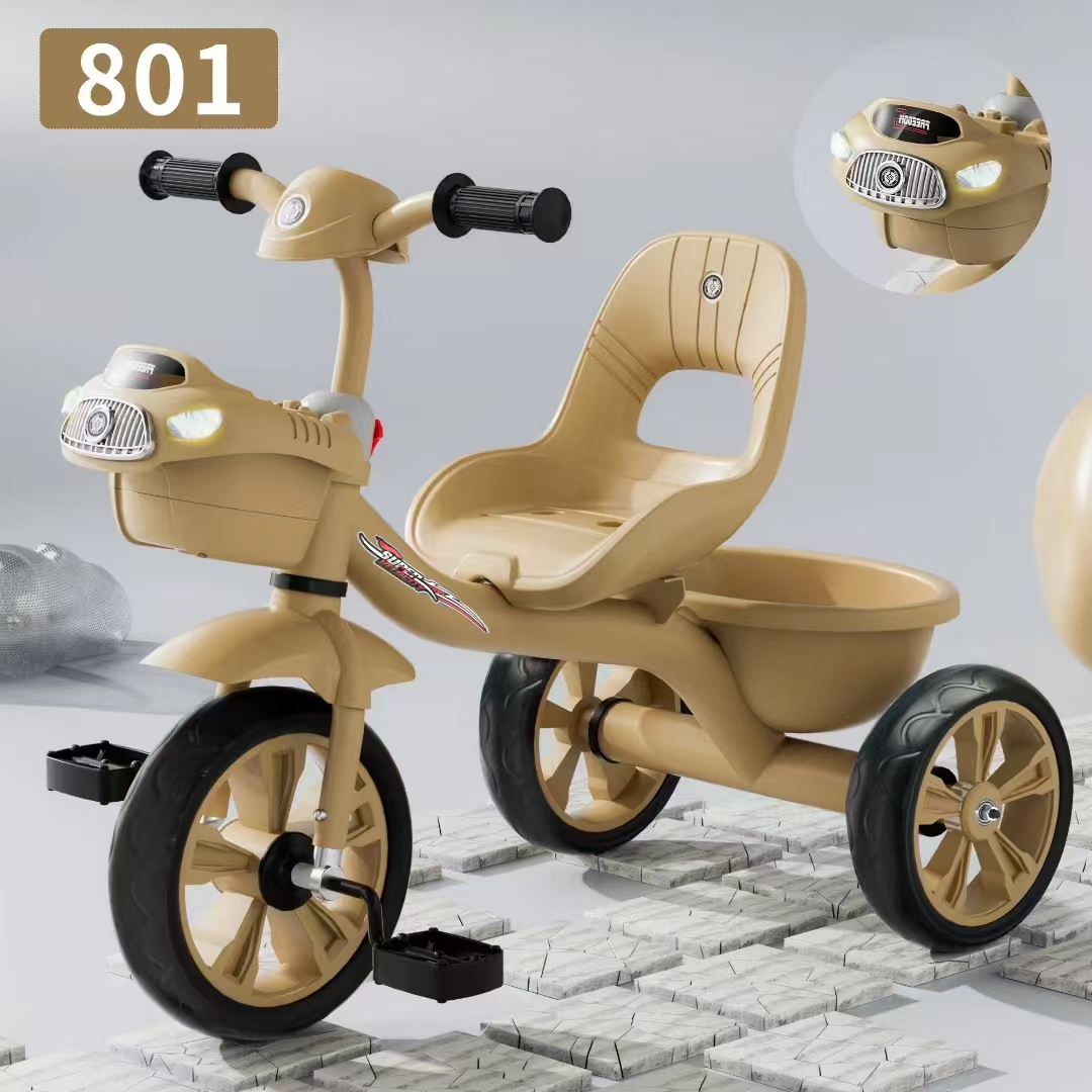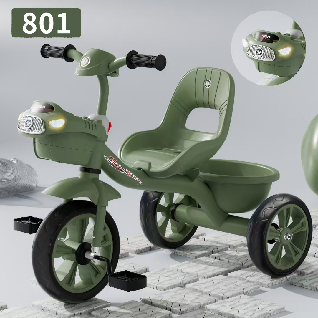 0.9mm thickened steel frame similar moto model, 0.8mm steel fork, safe and environmentally friendly handlebars, beautiful plastic wheel with EVA tire , more soft enlarged seats, one click installation, children tricycle with light and music, enlarged rear basket, matte baking varnish, anti roll setting