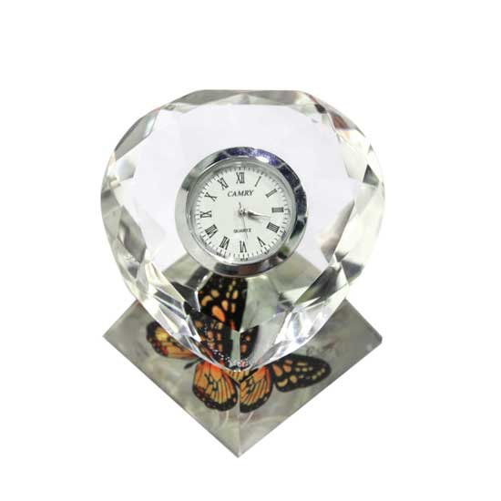 Displayed is a table clock featuring an elegant dial enclosed in a large piece of cut crystal. There is also a butterfly figure on the surface of the stand for added style. This beautiful timepiece is a great decoration for your home.