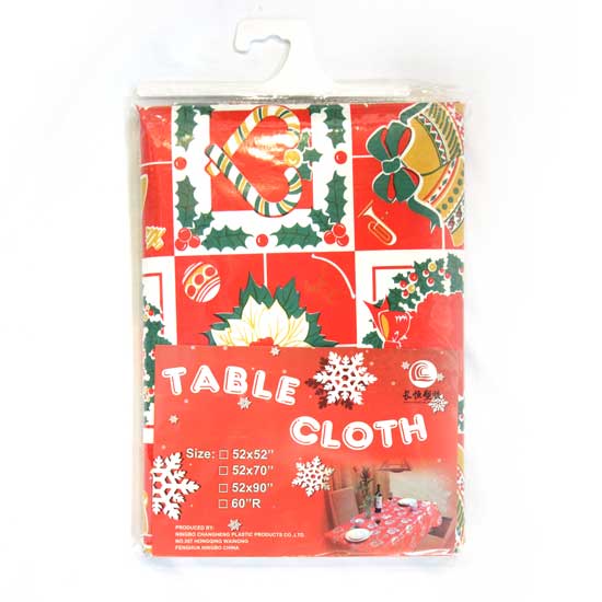 Highlighted is a table cloth with a delightful Christmas theme. The flannel backing offers skid resistance. The protective coating provides a long lasting and quality appearance.